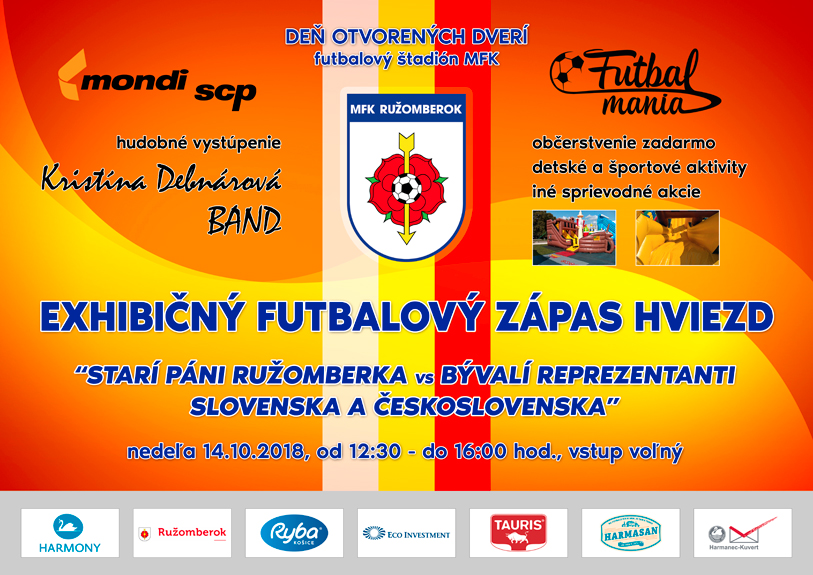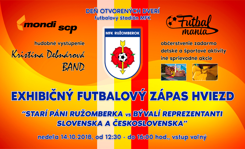 V nedeľu 14. októbra 2018 sme pre vás pripravili od 12:30 do 16:00 bohatý program na ružomberskom štadióne, kde sa odohrá exhibičný futbalový zápas hviezd medzi Starými pánmi Ružomberka a Bývalými reprezentantmi Slovenska a Česko-Slovenska. V priebehu podujatia vystúpi so svojou kapelou Kristína Debnárová a pre všetkých účastníkov podujatia je pripravený guláš, párky, pivo a minerálna voda zadarmo. Pre najmenších bude prichystaná veľká nafukovacia loď so šmýkačkou, trampolína, maľovanie na tvár a cukrová vata.