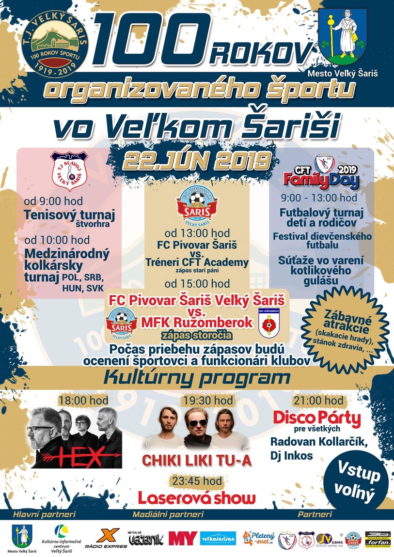 Priateľský duel s mužstvom účinkujúcim v 5. lige sa odohrá v sobotu 22. júna 2019 o 15:00 vo Veľkom Šariši. Veríme, že aj našou účasťou dopomôžeme k vydarenému priebehu osláv storočnice športu v meste s vyše 6-tisíc obyvateľmi.