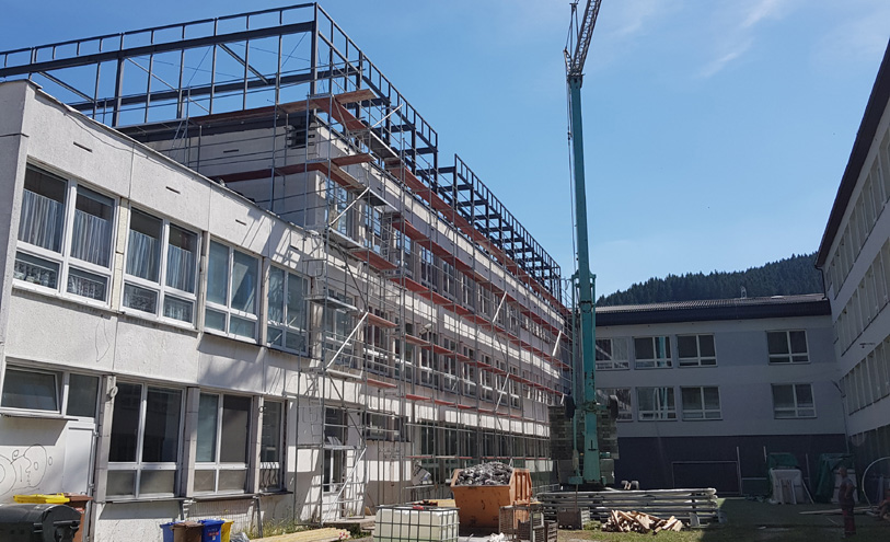 Prvým z uvedených projektov bola nadstavba ubytovacieho zariadenia v ZŠ Klačno. „Celá jednopodlažná nadstavba na bloku F sa skladá z pätnástich dvoj a trojposteľových ubytovacích izieb, zo samostatným hygienickým zázemím. Celkový počet lôžok pre žiakov je 34. Tento projekt nadstavby sa skladá aj zo stavby spevnenej plochy vstupu a dobudovania malého ihriska s umelou trávou, ktoré sa nachádza medzi traktami areálu školy. Momentálne dokončujeme oceľovú konštrukciu skeletu,“ povedal technický riaditeľ MFK Ružomberok.