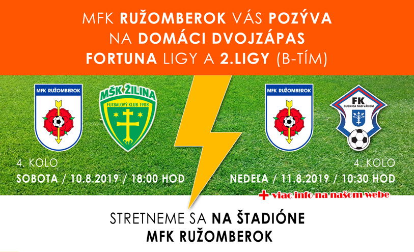 PS: Na druhý deň, v nedeľu 11. augusta 2019 o 10:30, B mužstvo doma privíta zatiaľ stopercentnú Dubnicu a taktiež bude potrebovať vašu podporu. Na tento duel bude otvorená východná tribúna. Vstupné na zápas je v základnej cene 3 € a pre dôchodcov, ako aj študentov s platným preukazom ISIC 2 €. Voľný vstup majú deti do 10 rokov v sprievode osoby so zakúpenou vstupenkou resp. permanentkou, držitelia preukazu ZŤP a Janského plakety (striebornej, zlatej a diamantovej) a mamičky s kočíkmi (do bezbariérového sektoru pri východnej tribúne) a členovia OZ Ružomberčan s členskou kartou. Návštevníci štadióna s nárokom na bezplatný vstup si taktiež musia v pokladni vyzdvihnúť vstupenku v nulovej hodnote, nakoľko všetky miesta sú na sedenie. Pokladne sú otvorené vždy hodinu pred začiatkom stretnutia. Voľný vstup majú taktiež aj držitelia permanentných vstupeniek na domáce zápasy Fortuna ligy, ktoré sa predávajú každý pondelok, stredu a piatok od 10:00 do 14:00 na ekonomickom oddelení MFK Ružomberok na východnej tribúne (pod sektorom G) v cene 55€.
