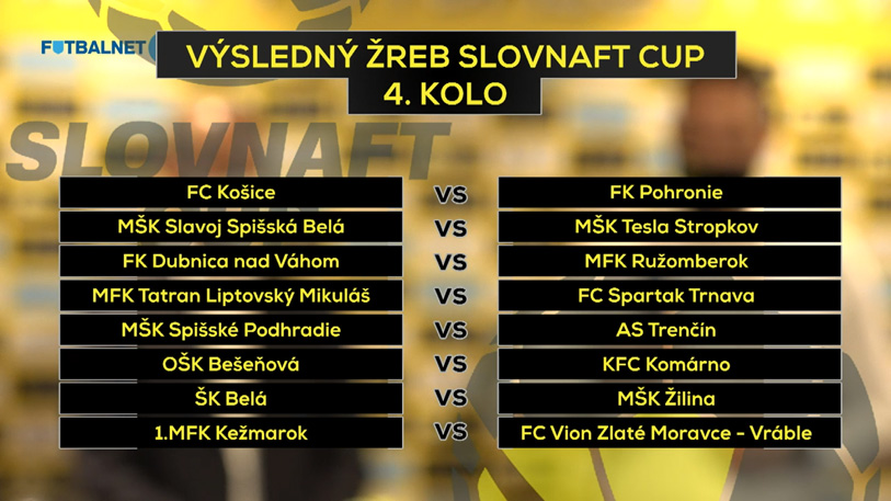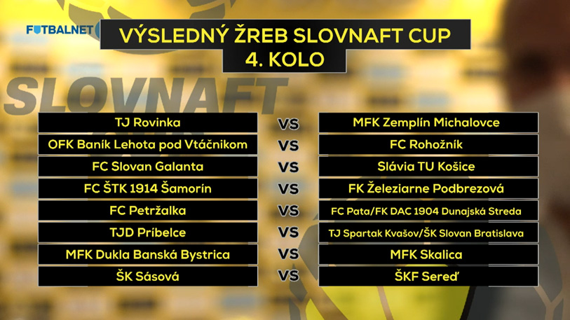 Aj štvrté kolo Slovnaft Cupu sa hrá na jedno stretnutie a pokiaľ sa nerozhodne v riadnej hracej dobe, na rad prídu pokutové kopy. Výhodu domáceho prostredia má náš súper. Všetky stretnutia tohto kola sú predbežne naplánované na stredu 21. októbra 2020. O presnom termíne a čase vás budeme informovať.