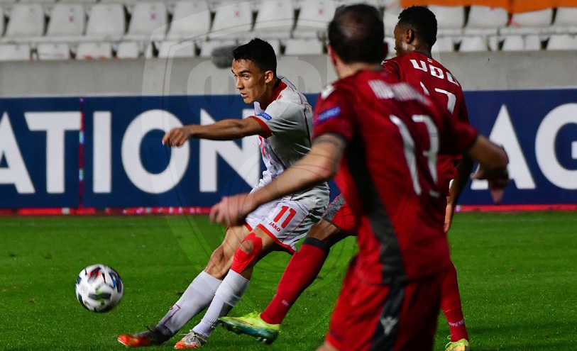 Keďže Severné Macedónsko malo o bod viac, na postup im stačilo neprehrať, zatiaľ čo Arménsko potrebovalo vyhrať. Hneď v úvode sa prezentoval streleckým pokusom spoza veľkého vápna Kostadinov, ale namieril mimo troch žrdí. Hostia počas úvodného dejstva preverili domáceho gólmana viacerými streleckými pokusmi spoza šestnástky, lenže Yurchenko nepustil loptu za svoj chrbát. Z domácich hráčov mal v úvodnom dejstve najväčšiu šancu Karapetyan, ktorého nebezpečné zakončenie z hranice pokutového územia v 25. minúte vyrazil Siskovski.