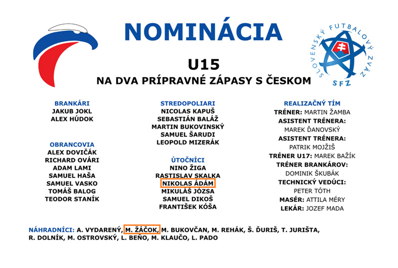 Aj slovenská futbalová reprezentácia do pätnásť rokov odohrá prípravné stretnutia s českými rovesníkmi. Prvé stretnutie je na programe 9. júna o 17:00 v Púchove a následná odveta sa uskutoční 11. júna o 11:00 v Nivniciach. Súčasťou 20-člennej nominácie trénera Martina Žambu je ružomberský útočník Nikolas Ádám a medzi náhradníkmi sa nachádza obranca Marek Žáčok.