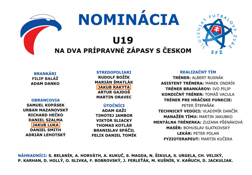 Reprezentačný tím SR “19“ čakajú na začiatku mesiaca dve prípravné stretnutia s rovesníkmi z Česka. Prvý duel sa odohrá 3. júna o 17:00 v Senci a druhý 6. júna o 11:00 v Dunajskej Strede. Tréner Albert Rusnák nominoval aj nášho obrancu Jakuba Luku a stredopoliara Jakuba Rakytu.