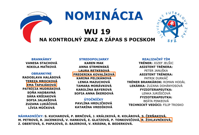 Slovenská ženská futbalová reprezentácia do devätnásť rokov má naplánovaný zraz v dňoch od 7. do 11. júna 2021 v Poprade, kde v posledný deň zrazu o 13:00 odohrá prípravný zápas s rovesníčkami z Poľska. V 22-člennej nominácii trénera Jozefa Jelšica sú aj ružomberské futbalistky Ema Ťapajáková a Frederika Kovalíková. Medzi náhradníčkami sa nachádza Rebeka Žihlavníková.
