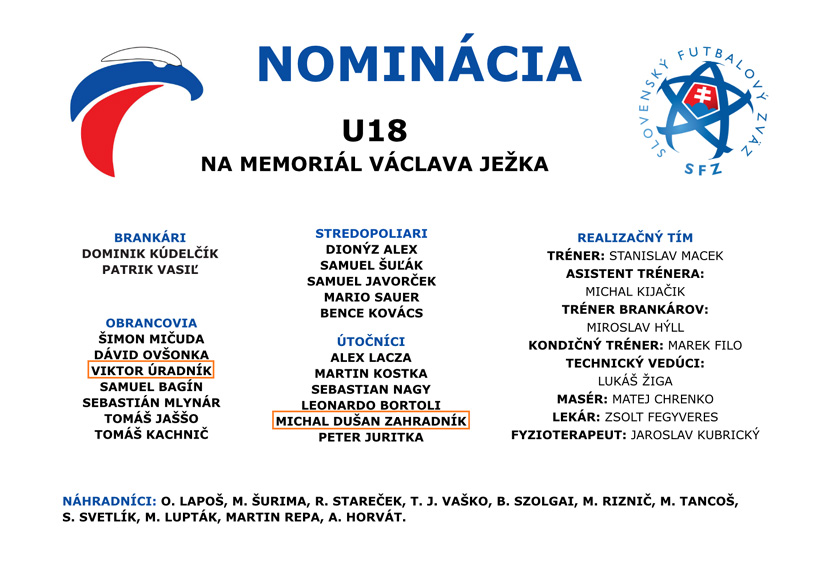 Reprezentačný tím do osemnásť rokov odcestuje do Česka, kde si na turnaji Memoriál Václava Ježka zmeria sily s výbermi Nemecka (1. 9. o 17:00, Hluboká nad Vltavou), Česka (3. 9. o 17:00, Hluboká nad Vltavou) a Rakúska (5. 9. o 11:00, Prachatice). Tréner Stanislav Macek nominoval dvoch našich futbalistov – Viktora Úradníka a Michala Dušana Zahradníka.