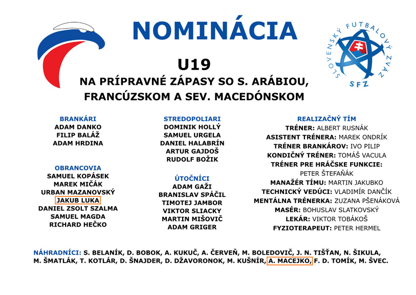 Slovenskú futbalovú reprezentáciu do devätnásť rokov čakajú na začiatku septembra v Slovinsku prípravné zápasy s rovesníkmi zo Saudskej Arábie (2. 9. o 16:30), Francúzska (4. 9. o 17:00) a Severného Macedónska (7. 9. o 12:00). V nominácii trénera Alberta Rusnáka st. je aj ružomberský obranca Jakub Luka (na foto). Medzi náhradníkmi sa nachádza útočník Adrián Macejko.