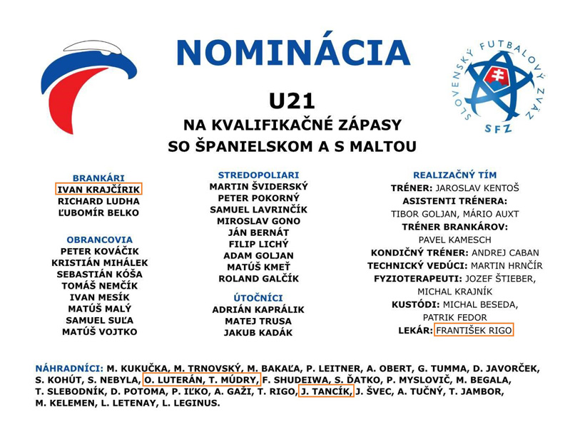 Tréner Jaroslav Kentoš opäť nominoval ružomberského brankára Ivana Krajčírika, ktorý odchytal obidva predchádzajúce kvalifikačné stretnutia, pričom obidva góly inkasoval z pokutového kopu a svoju formu dokazuje aj v prebiehajúcom ročníku Fortuna ligy, kde v deviatich kolách päťkrát udržal čisté konto. Medzi náhradníkmi sa nachádzajú stredopoliari Oliver Luterán, Timotej Múdry a Jakub Tancík. V realizačnom tíme náš klub zastupuje lekár František Rigo.