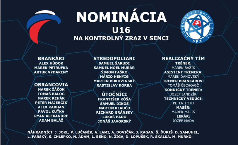 Rovnako v pondelok 14. februára má naplánovaný kontrolný zraz aj slovenská futbalová reprezentácia do šestnásť rokov. Marek Bažík nominoval na zraz v Senci aj Mareka Žáčoka a Petra Majerčíka. Medzi náhradníkmi sa nachádza Daniel Lopušek.