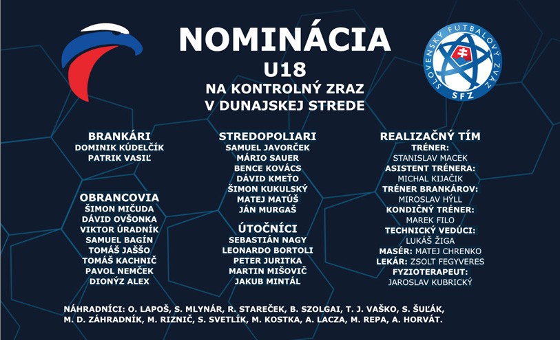 V pondelok 14. februára sa v Dunajskej Strede uskutoční kontrolný zraz slovenskej „osemnástky“. Tréner Stanislav Macek nominoval 22-futbalistov vrátane Viktora Úradníka, Pavla Nemčeka a Matúša Mateja