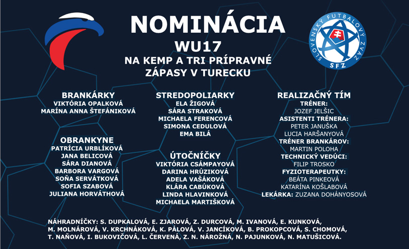 Dievčatá zo SR WU17 čaká tréningový kemp v Turecku, kde odohrajú tri prípravné stretnutia, keď si 19. februára zmerajú sily s rovesníčkami z Ruska a 22. aj 25. februára s výberom Bieloruska. Všetky duely sa odohrajú o 14:00 SEČ. V nominácii trénera Jozefa Jelšica je Darina Hrúziková a medzi náhradníčkami sa nachádza Erika Zjarová.
