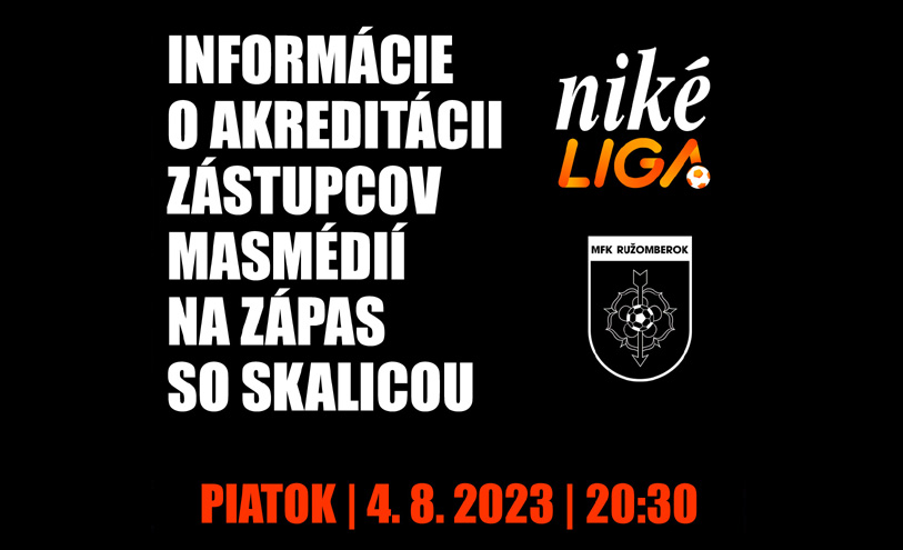 Mestský futbalový klub Ružomberok oznamuje, že akreditácia zástupcov masmédií na úvodný domáci zápas sezóny 2023/24 Niké ligy MFK Ružomberok – MFK Skalica, ktorý sa hrá 4. augusta 2023, so začiatkom o 20:30 hod., je do 3. augusta 2023.