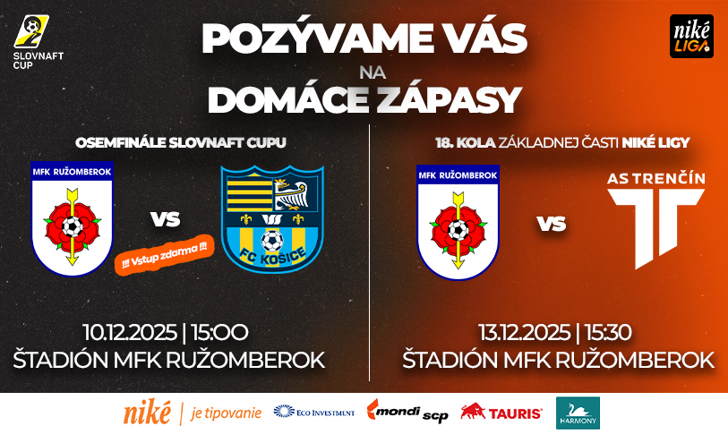 Veríme, že aj v týchto dvoch súbojoch sa hráči budú môcť spoľahnúť na vašu výbornú podporu z tribún a že sa prídete rozlúčiť s jesennou časťou v čo najväčšom počte! Tešiť sa môžete na polčasovú súťaž a širokú ponuku jedál a nápojov na štadióne. Zároveň deti do pätnásť rokov majú vstup na naše domáce zápasy zadarmo. Pre tých, ktorí ešte nemajú nový klubový dres, vo fanshopoch na obidvoch tribúnach nájdete aktuálne dresy A-tímu, vrátane detských veľkostí. Taktiež pokračuje aj predaj kalendárov MFK Ružomberok 2026.