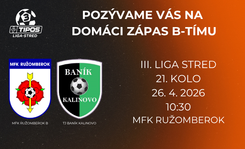 V nedeľu 26. apríla 2026 o 10:30 odohrá naše B-mužstvo na hlavnom ihrisku ružomberského štadióna súboj dvadsiateho prvého kola III. ligy Stred s klubom TJ Baník Kalinovo.
