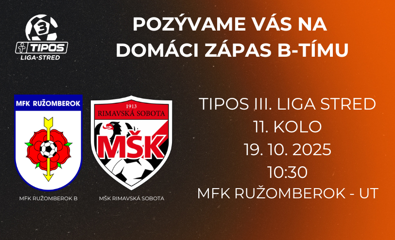 V nedeľu 19. októbra 2025 o 10:30 odohrá naše B-mužstvo na umelom trávniku v areáli ružomberského štadióna súboj jedenásteho kola TIPOS III. LIGY STRED s Rimavskou Sobotou.