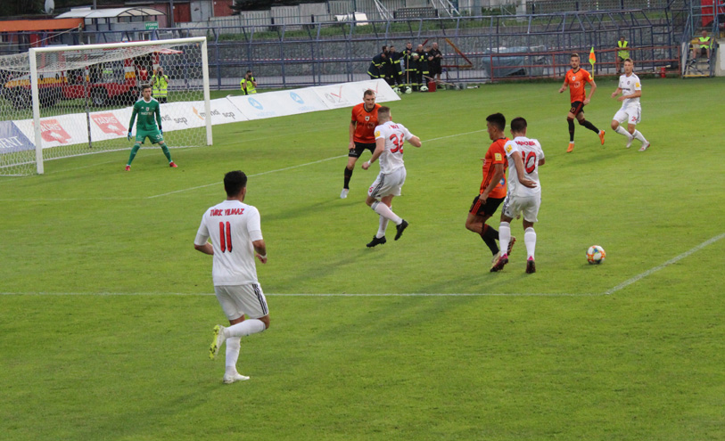 In the sixth minute guest defender blocked Maslo´s shot from a free kick. After fifteen minutes Takáč did not use Brenkus´s pass and missed the target from behind of the penalty area. Subsequently Krajčírik tipped Yilamz´s shot. In the twenty-seventh minute Danbubić did not use Lovat´s pass and just missed the target. About thirteen minutes later Mitrea scored from a penalty kick – 0:1.