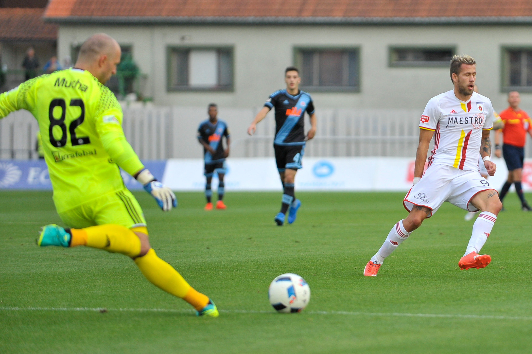 Lopta po priamom kope Jána Masla končí v sieti - 1:0.