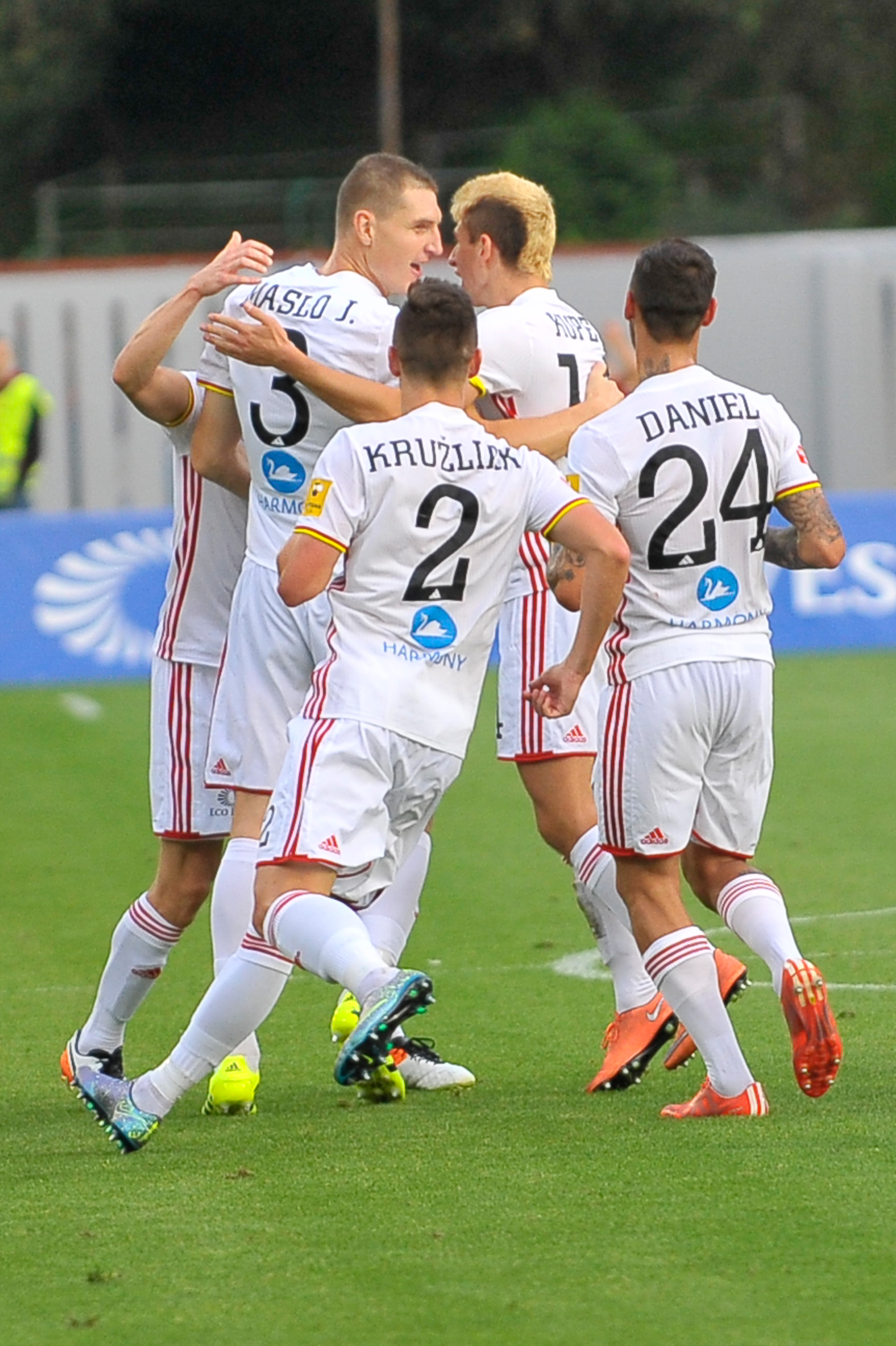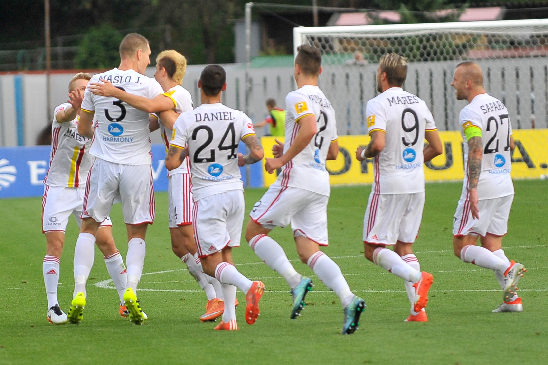 Ján Maslo oslavuje so spoluhráčmi svoj gól.