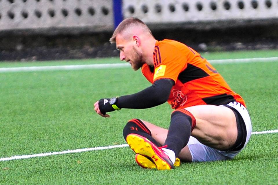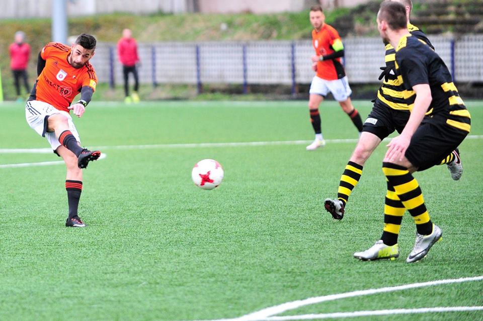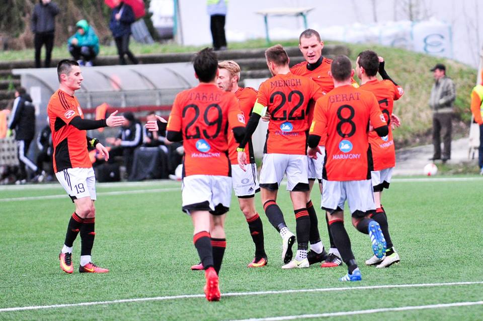 Miloš Lačný sa so spoluhráčmi teší z gólu.