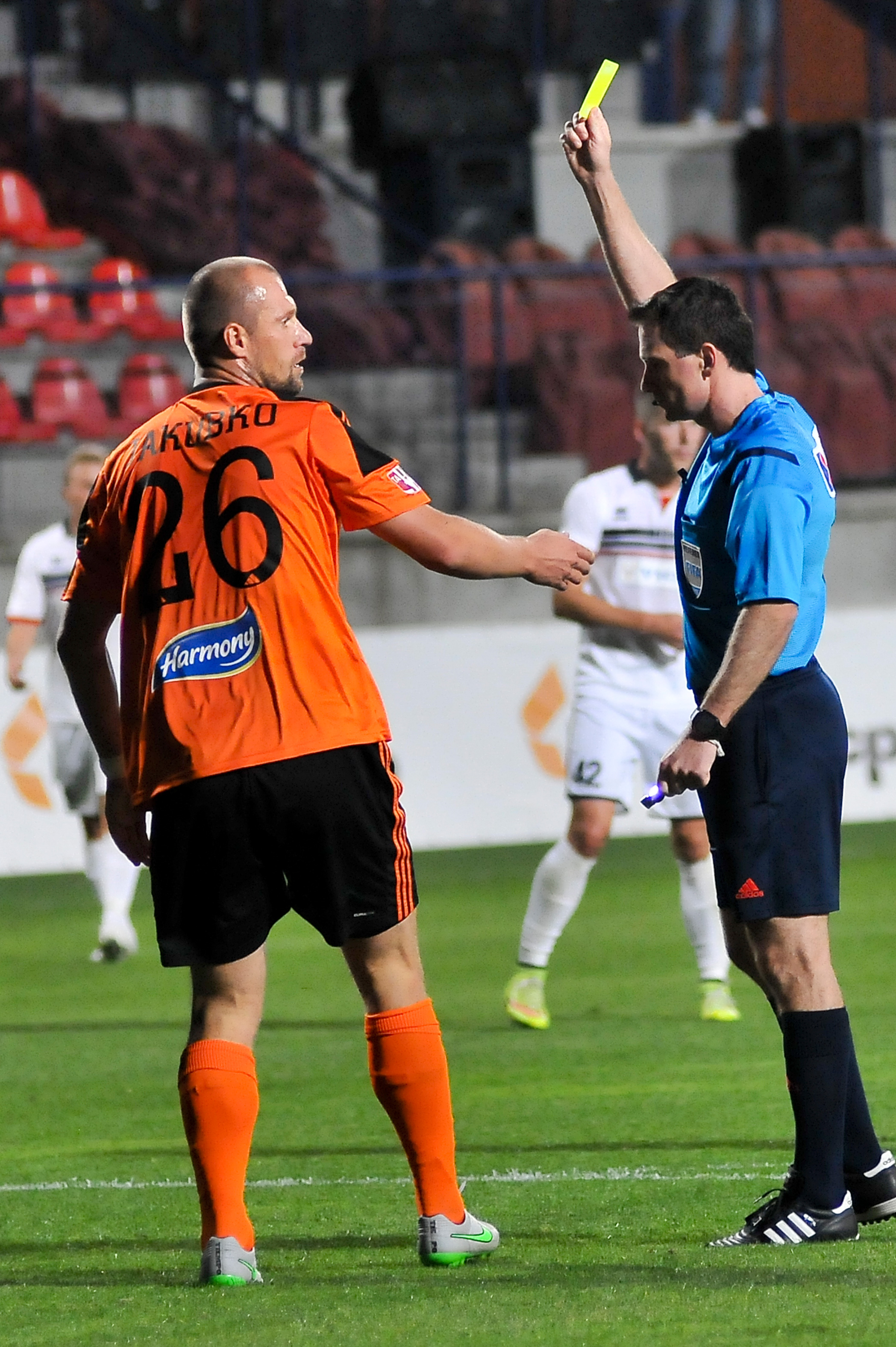 Martin Jakubko dostáva od hlavného rozhodcu žltú kartu.