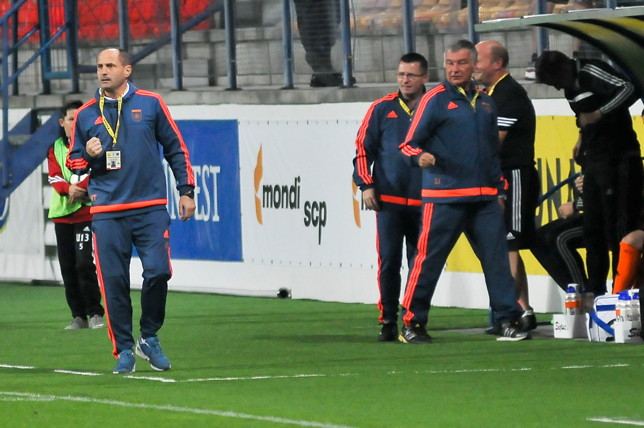 Ružomberský realizačný tím po góle - hlavný tréner Ladislav Pecko, masér Juraj Hervartovský, lekár MUDr. Tibor Letko a vedúci mužstva Peter Adamčiak.