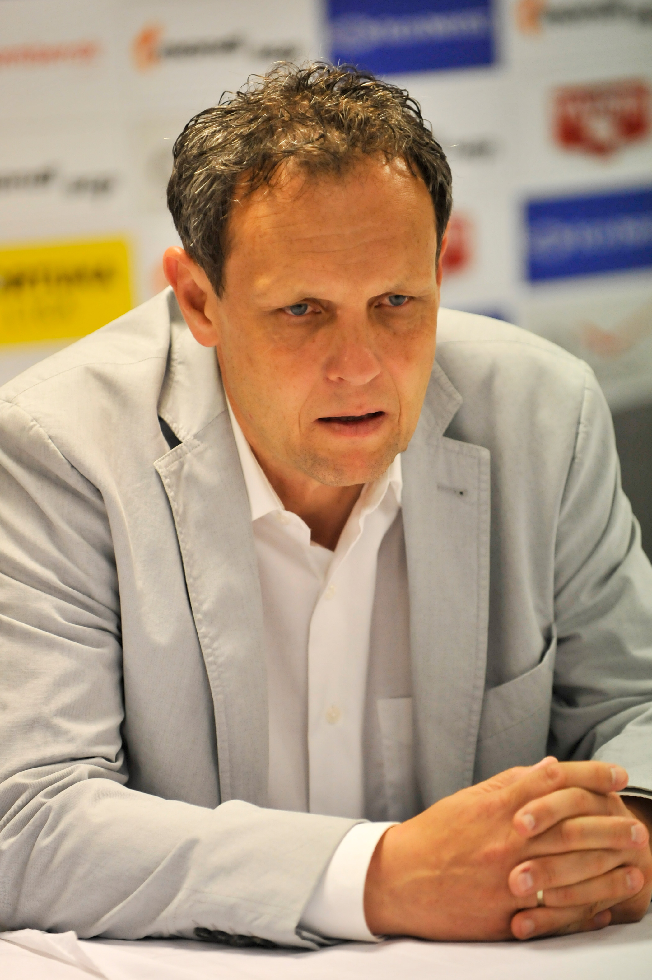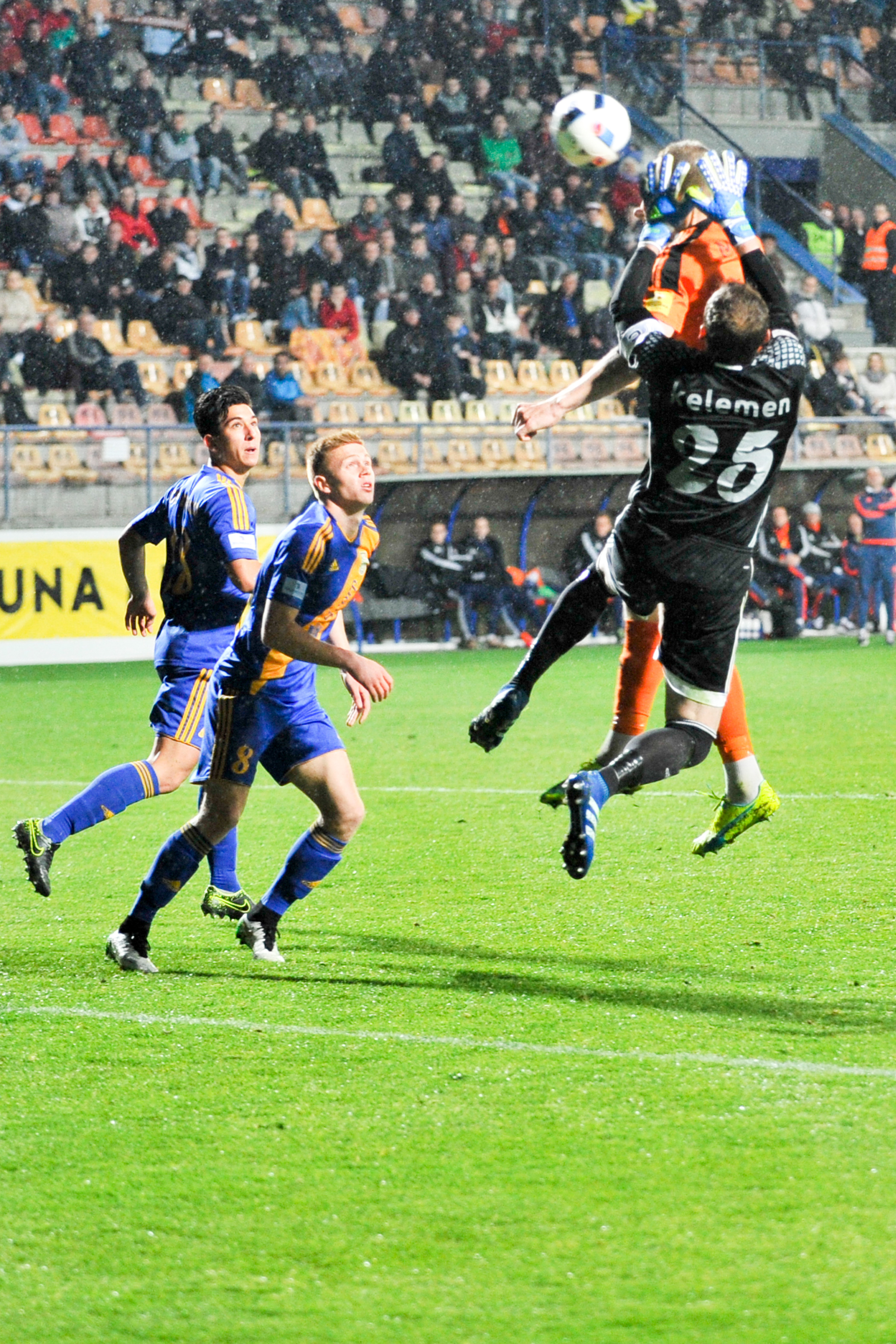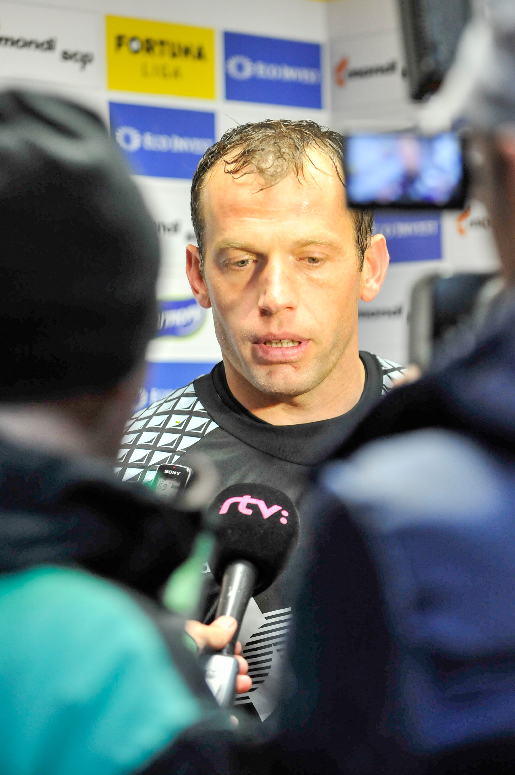 Marián Kelemen sa snaží zachytiť loptu pre Jánom Maslom