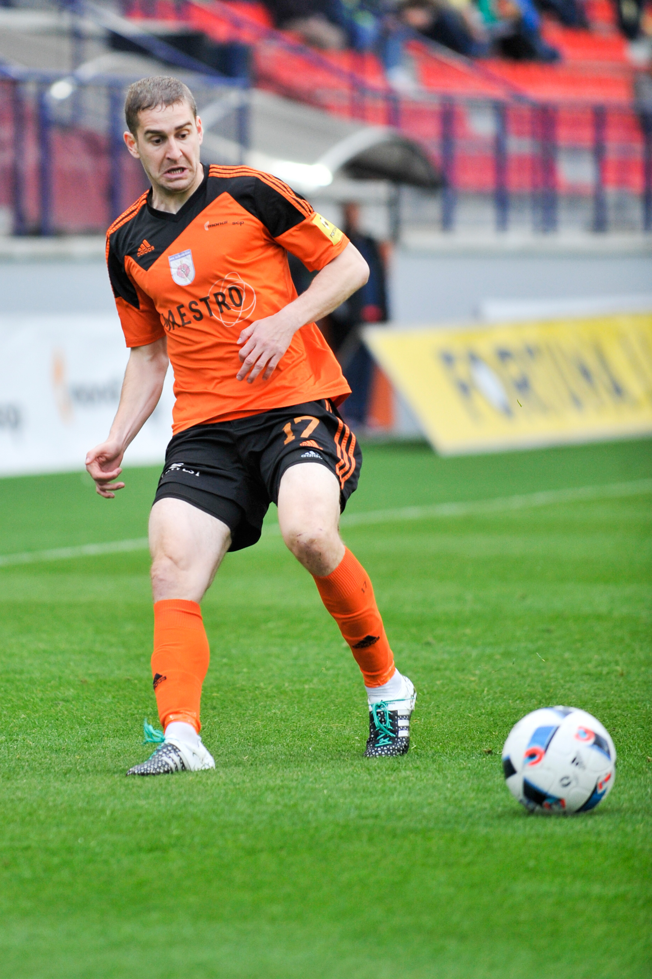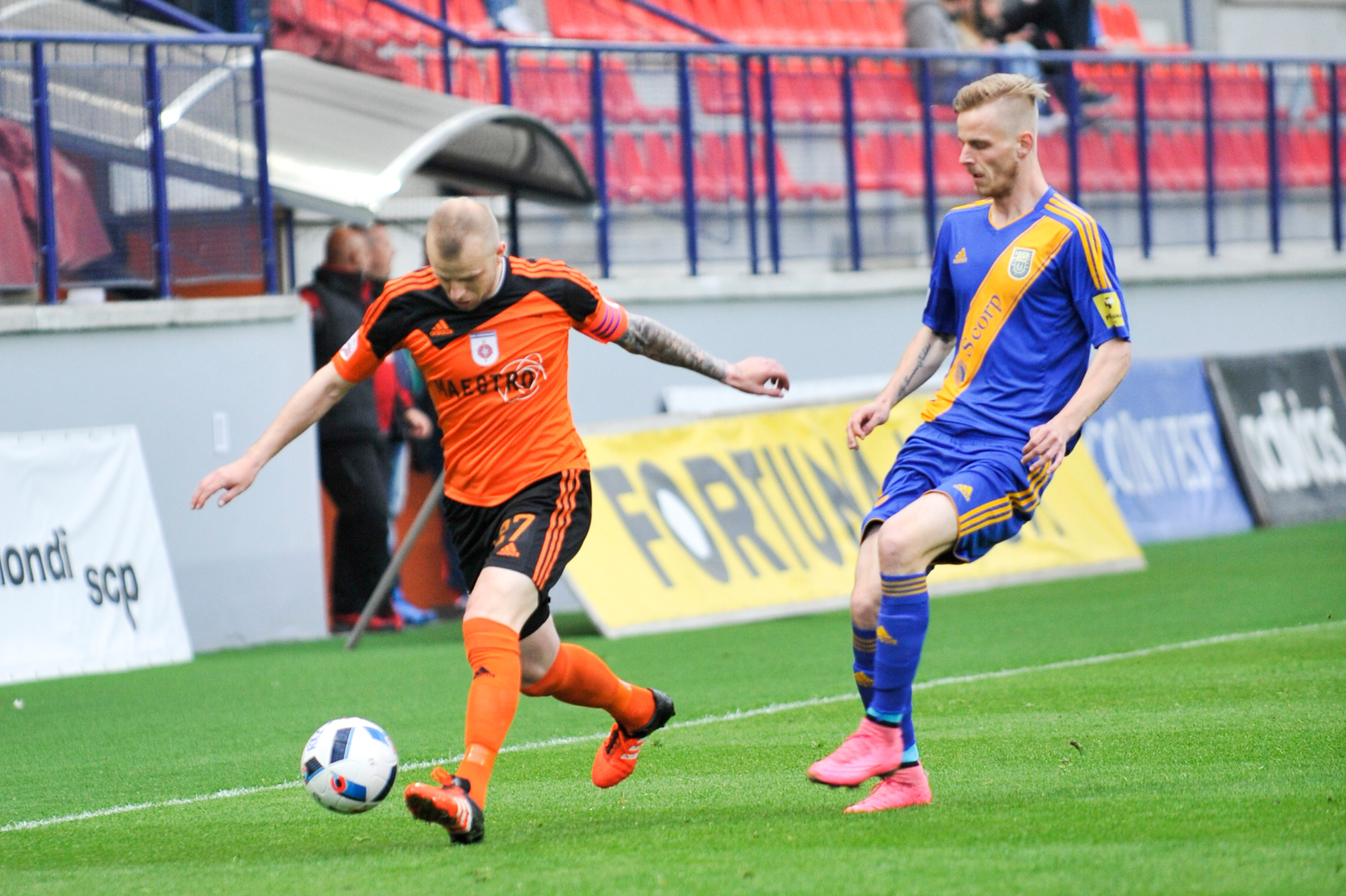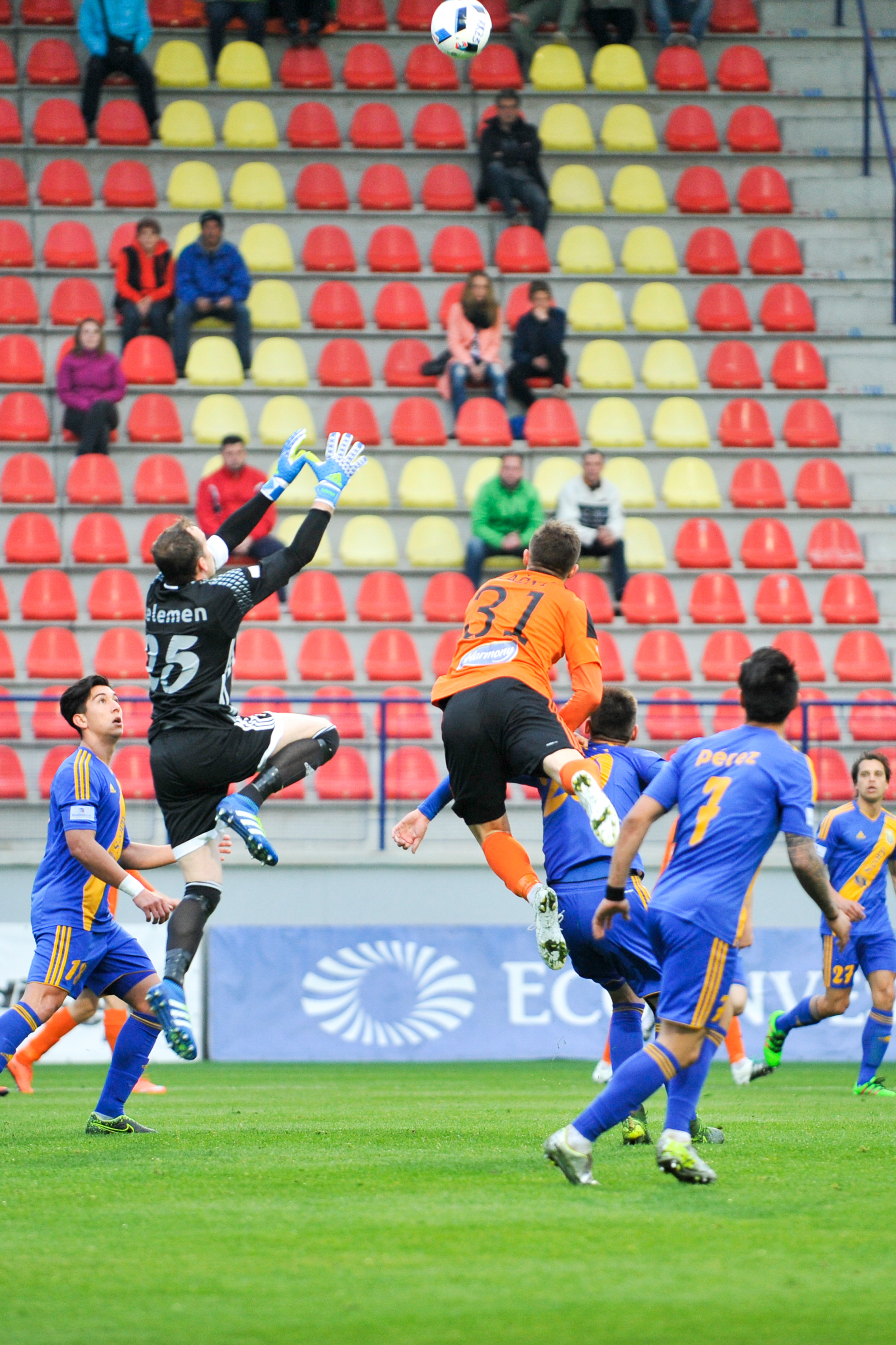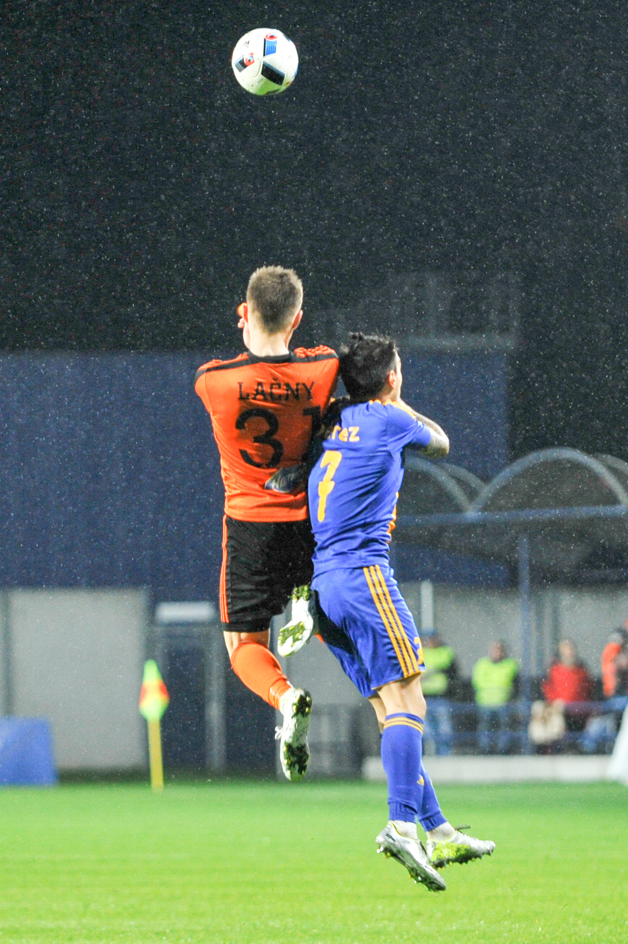 Miloš Lačný v hlavičkovom súboji s Marcosom Calerom Perezom