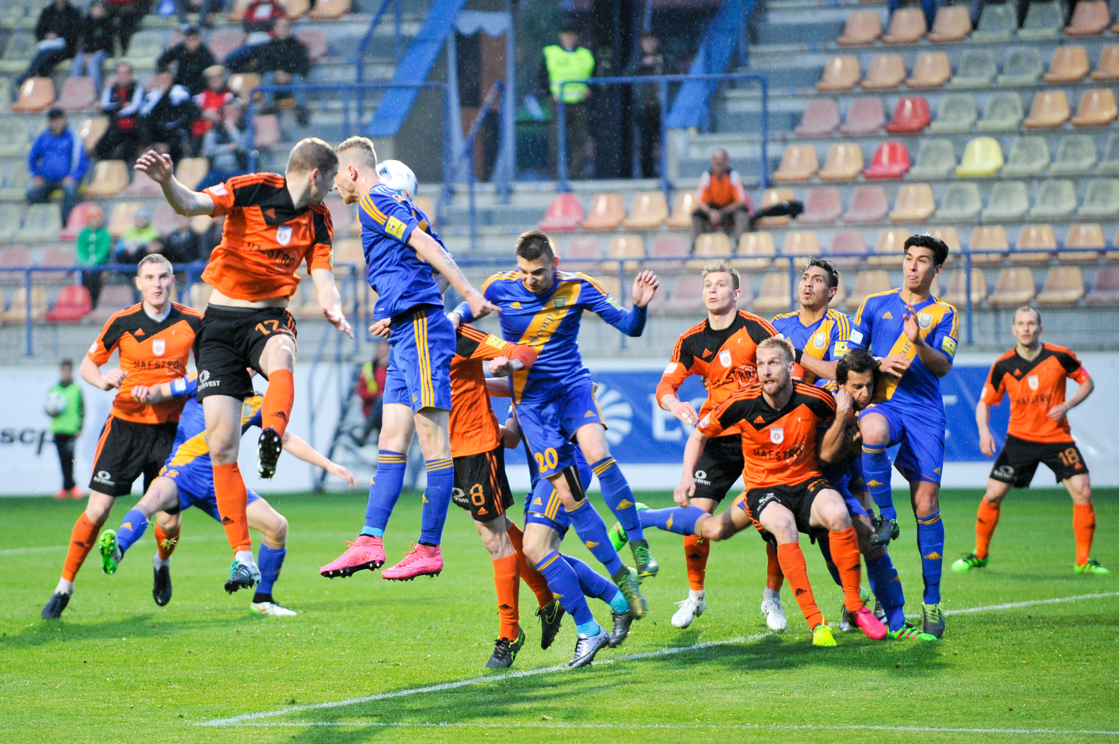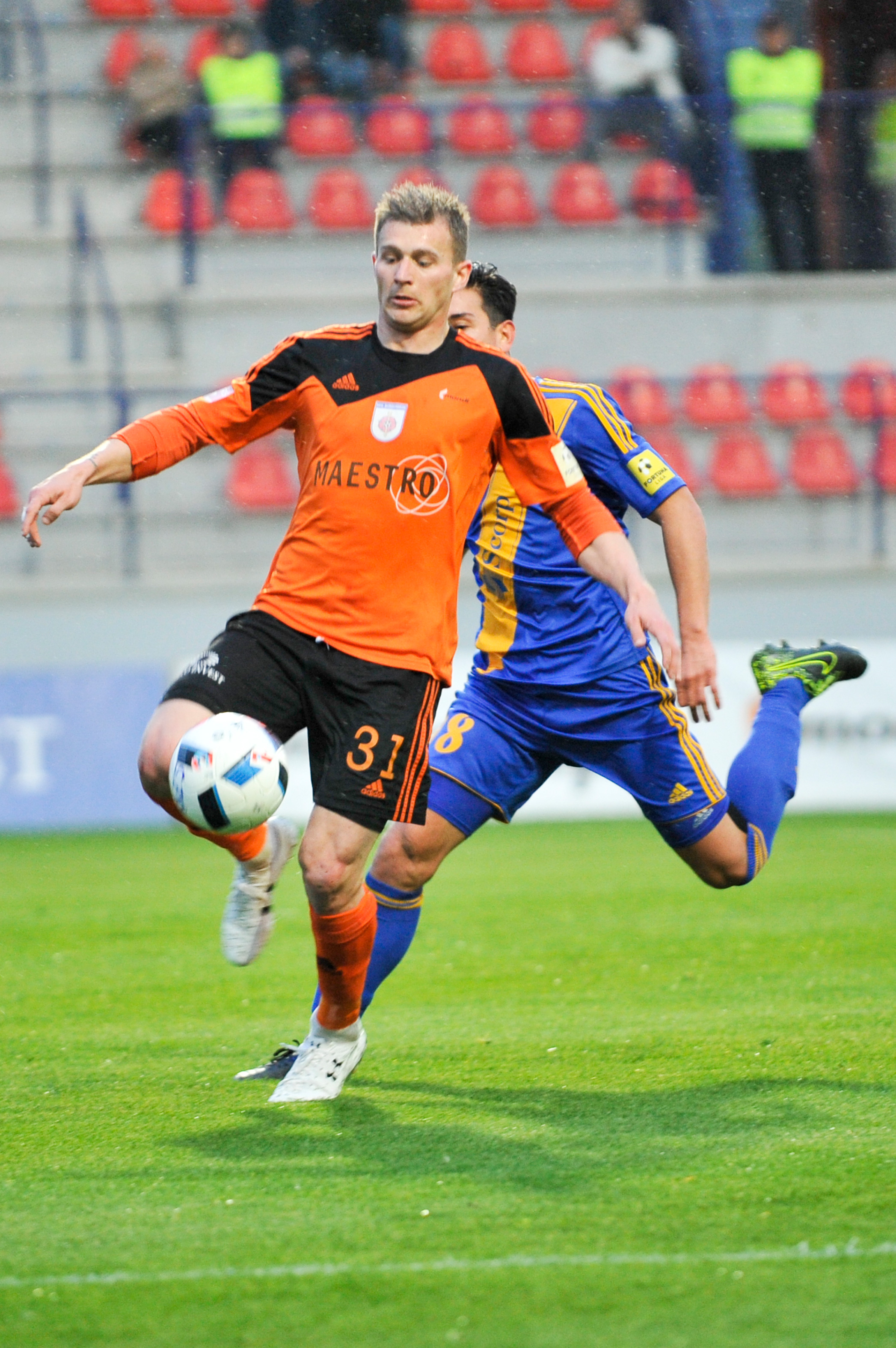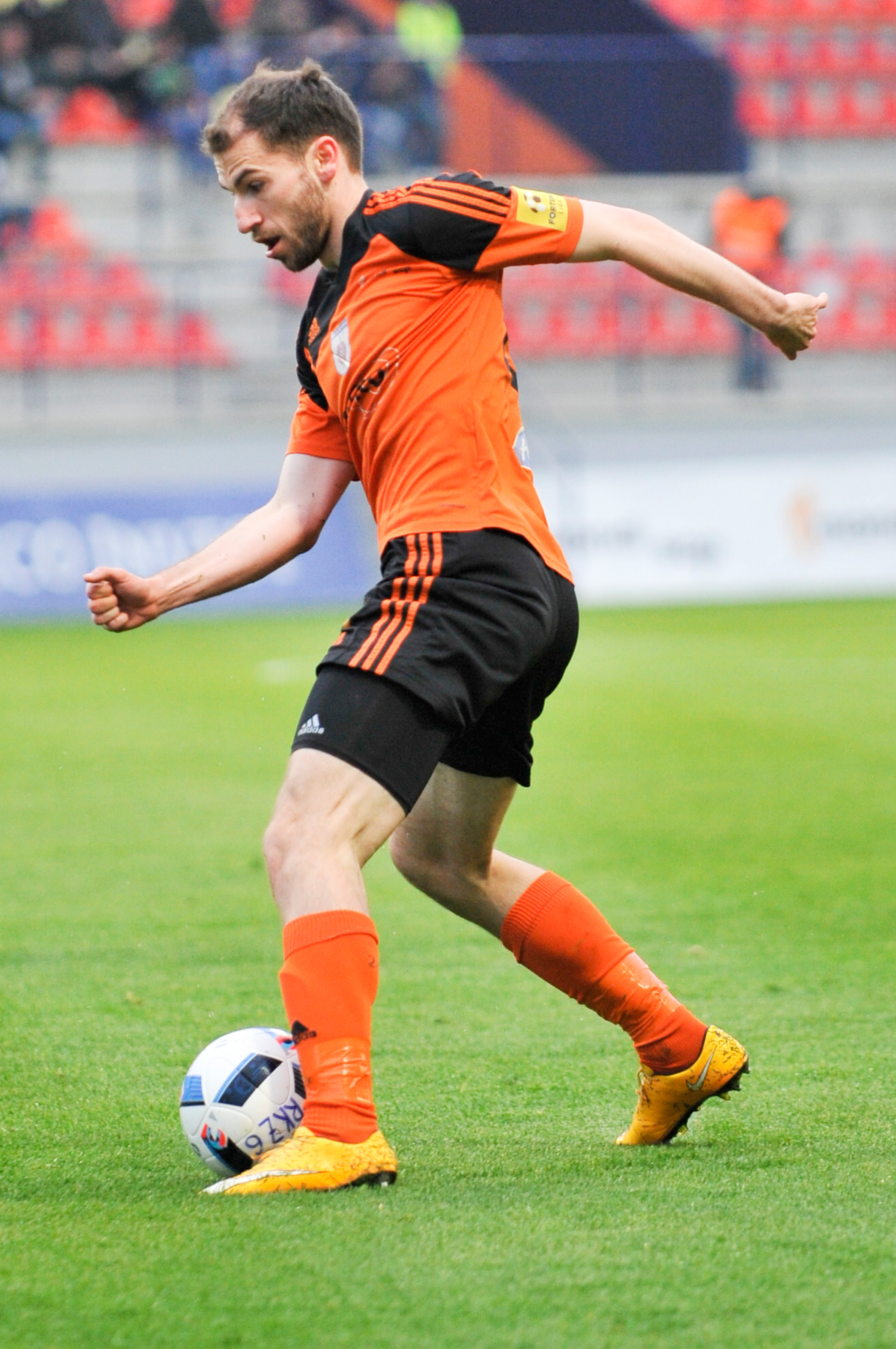 Miloš Lačný v hlavičkovom súboji s Marcosom Calerom Perezom