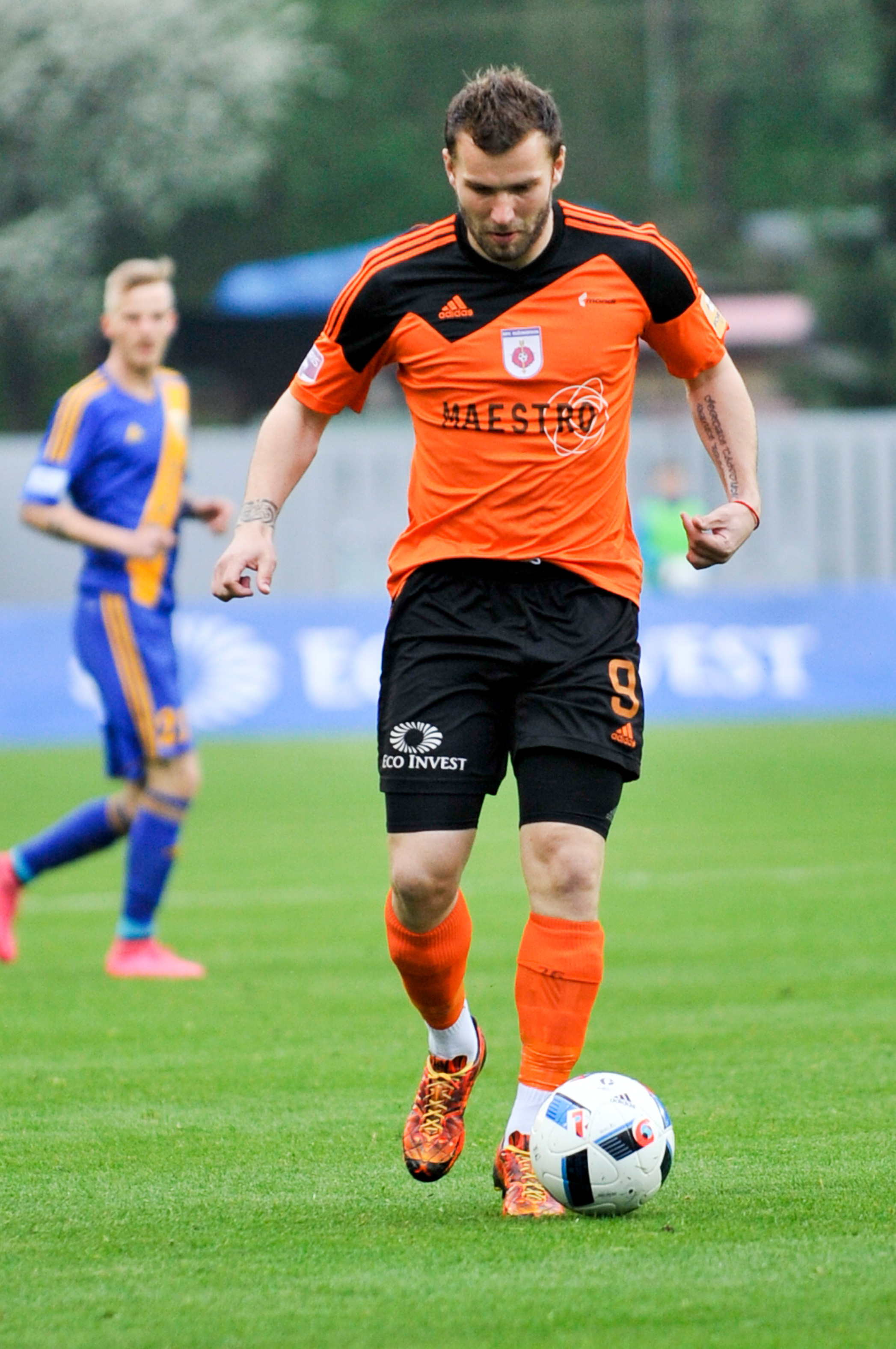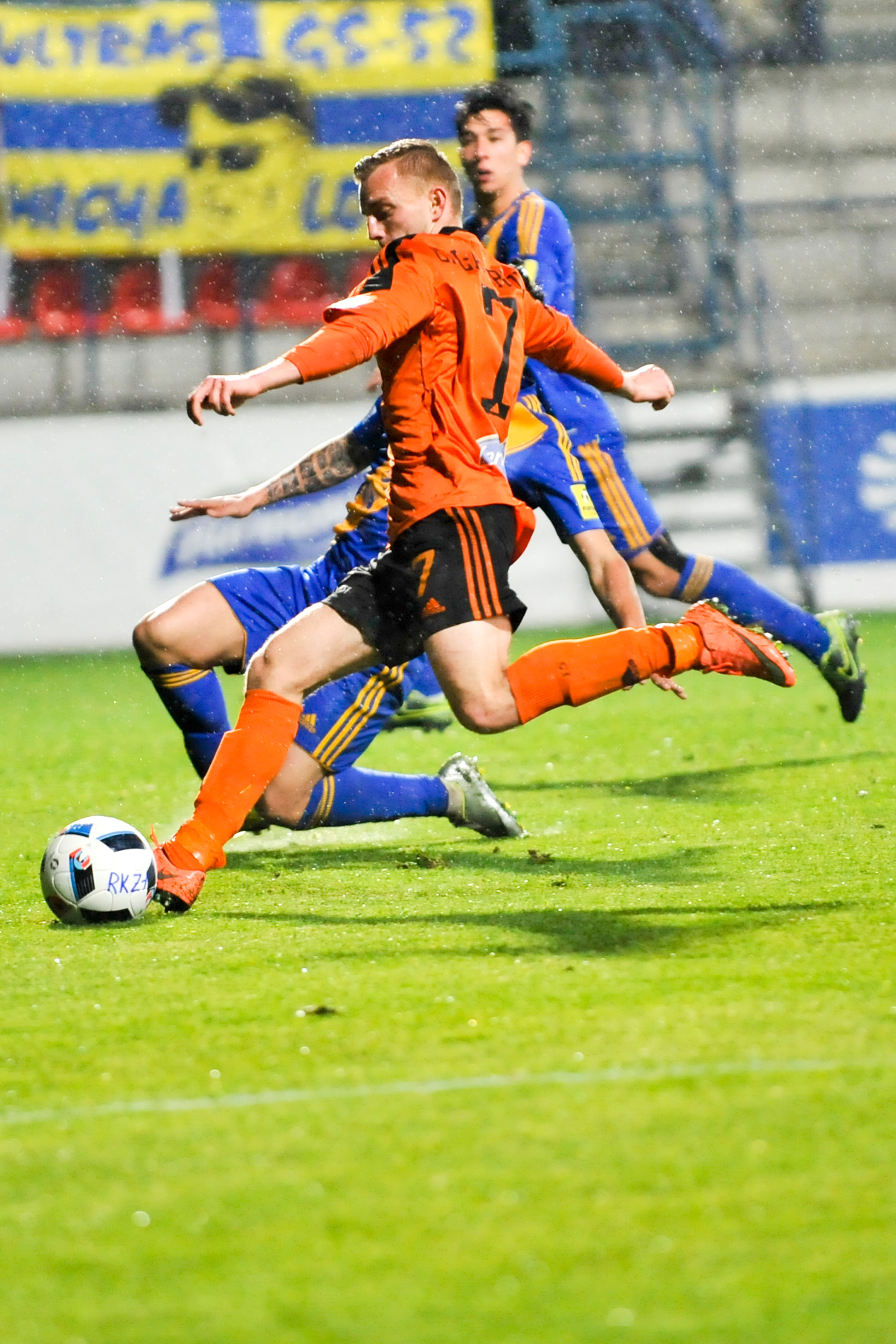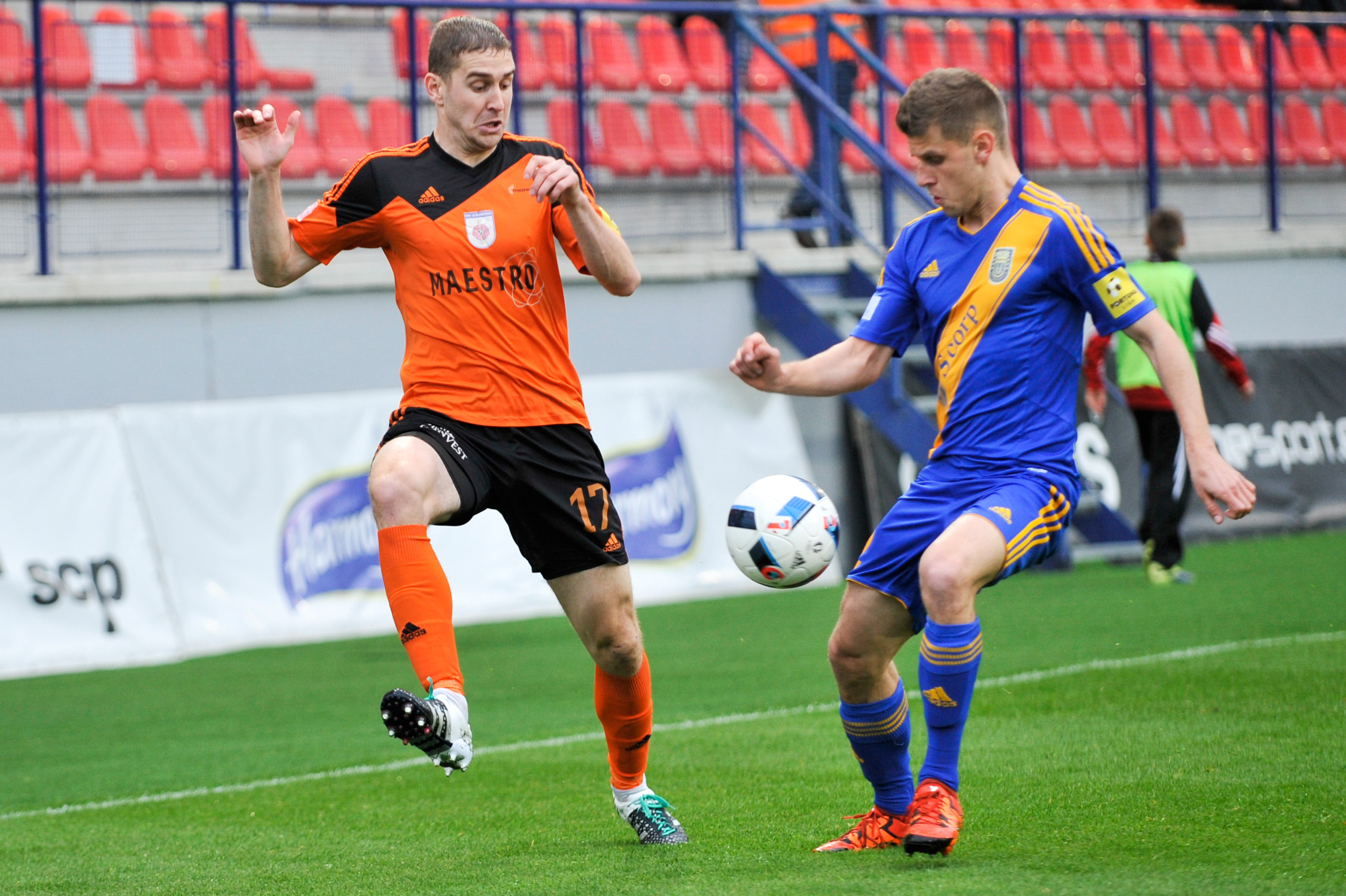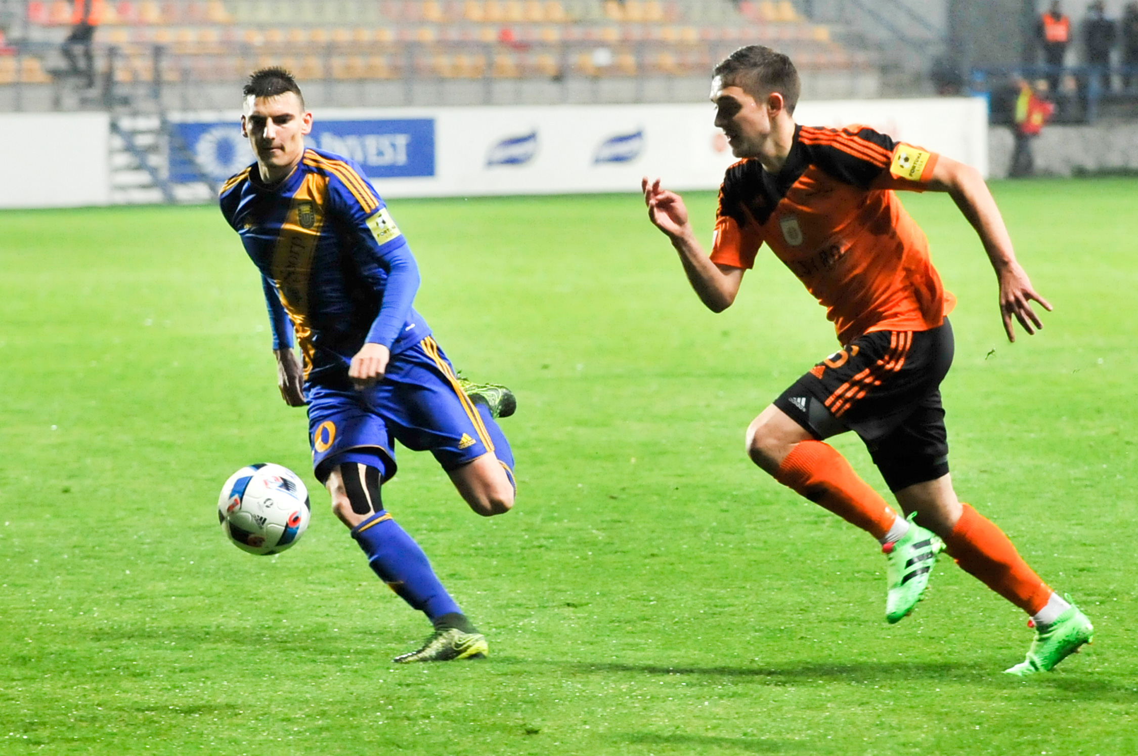Miloš Lačný v hlavičkovom súboji s Marcosom Calerom Perezom