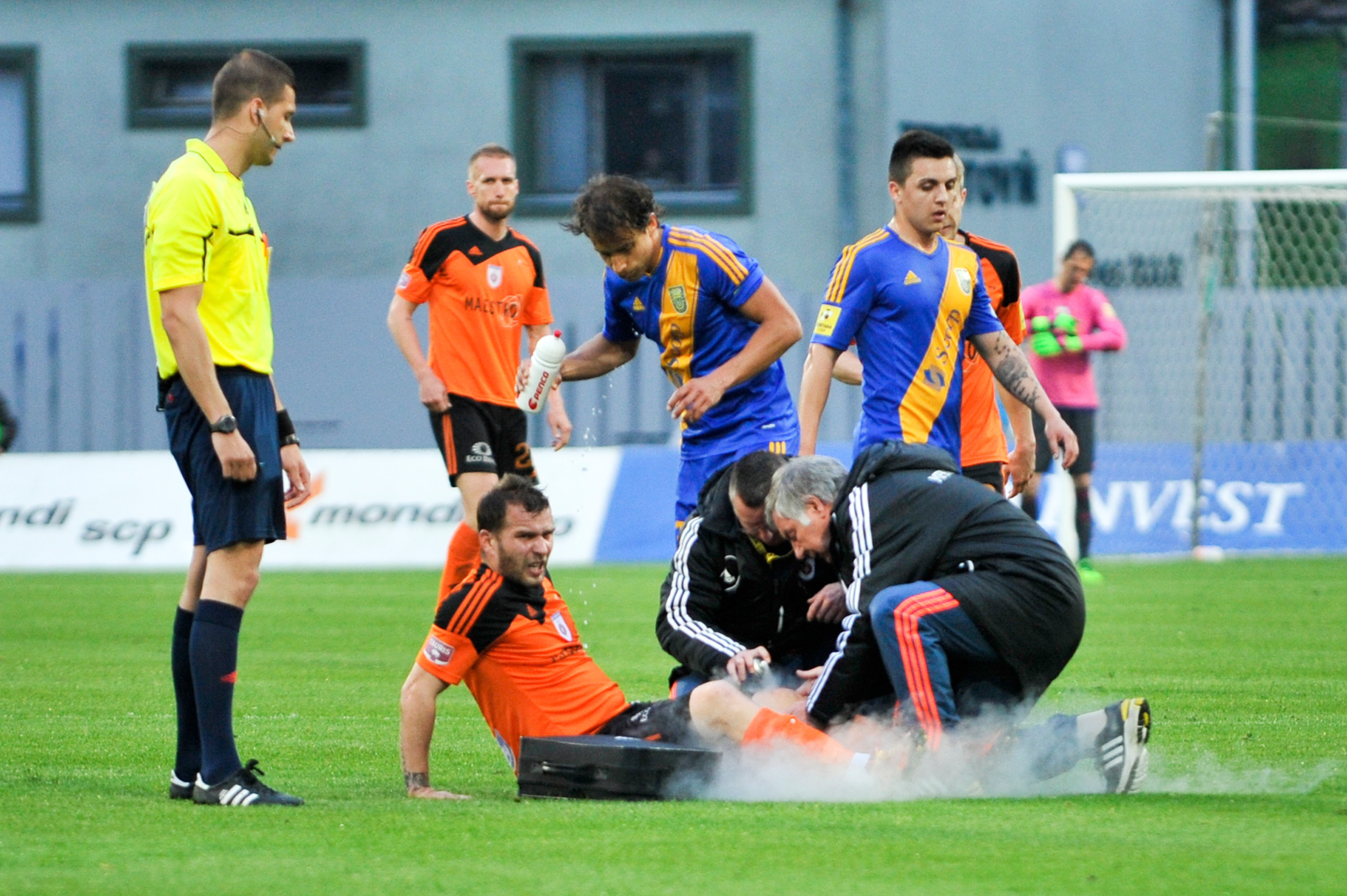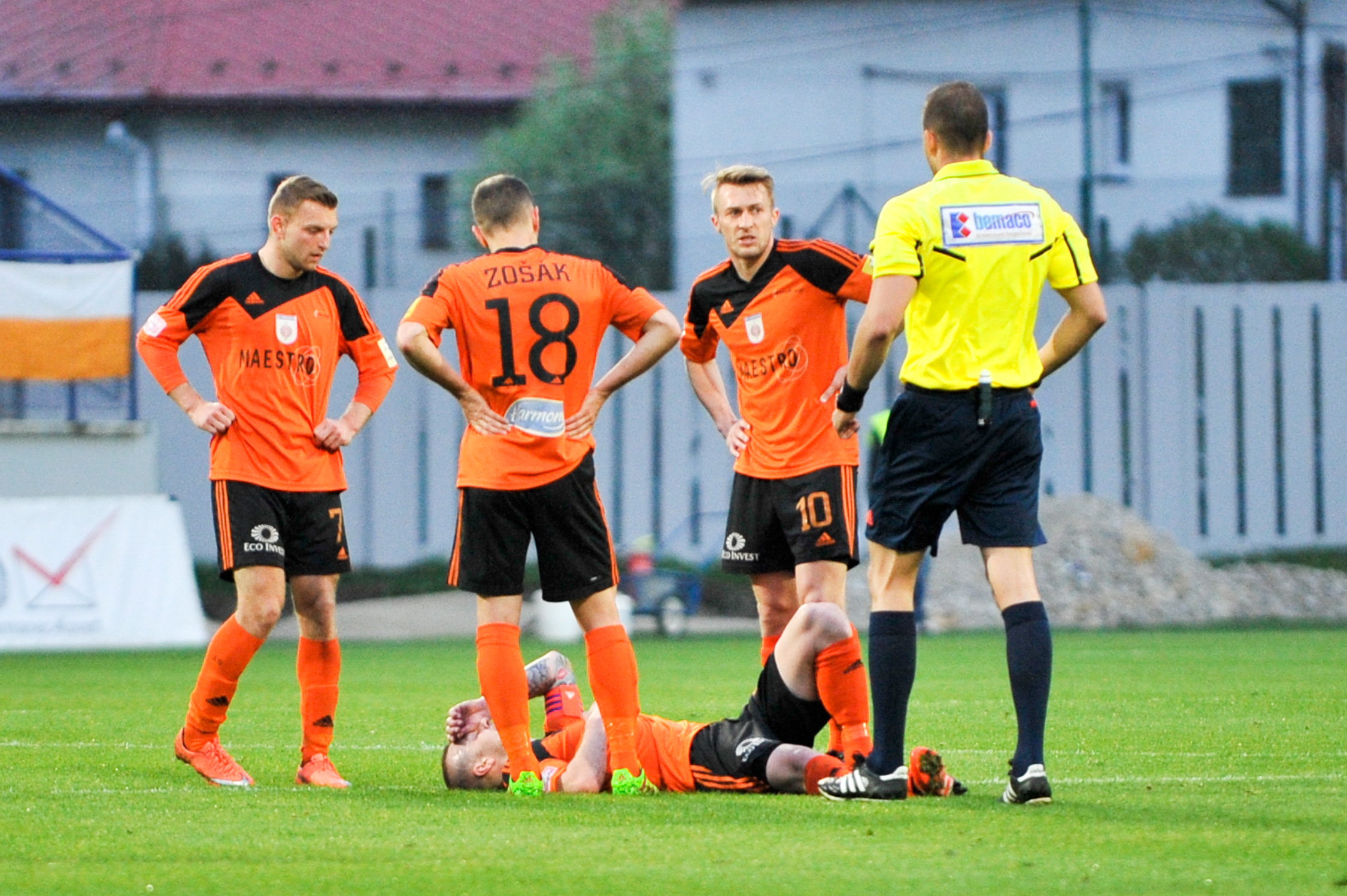 Zranený Marek Sapara, pri ňom Peter Gal Andrezly, Štefan Zošák a Martin Nagy
