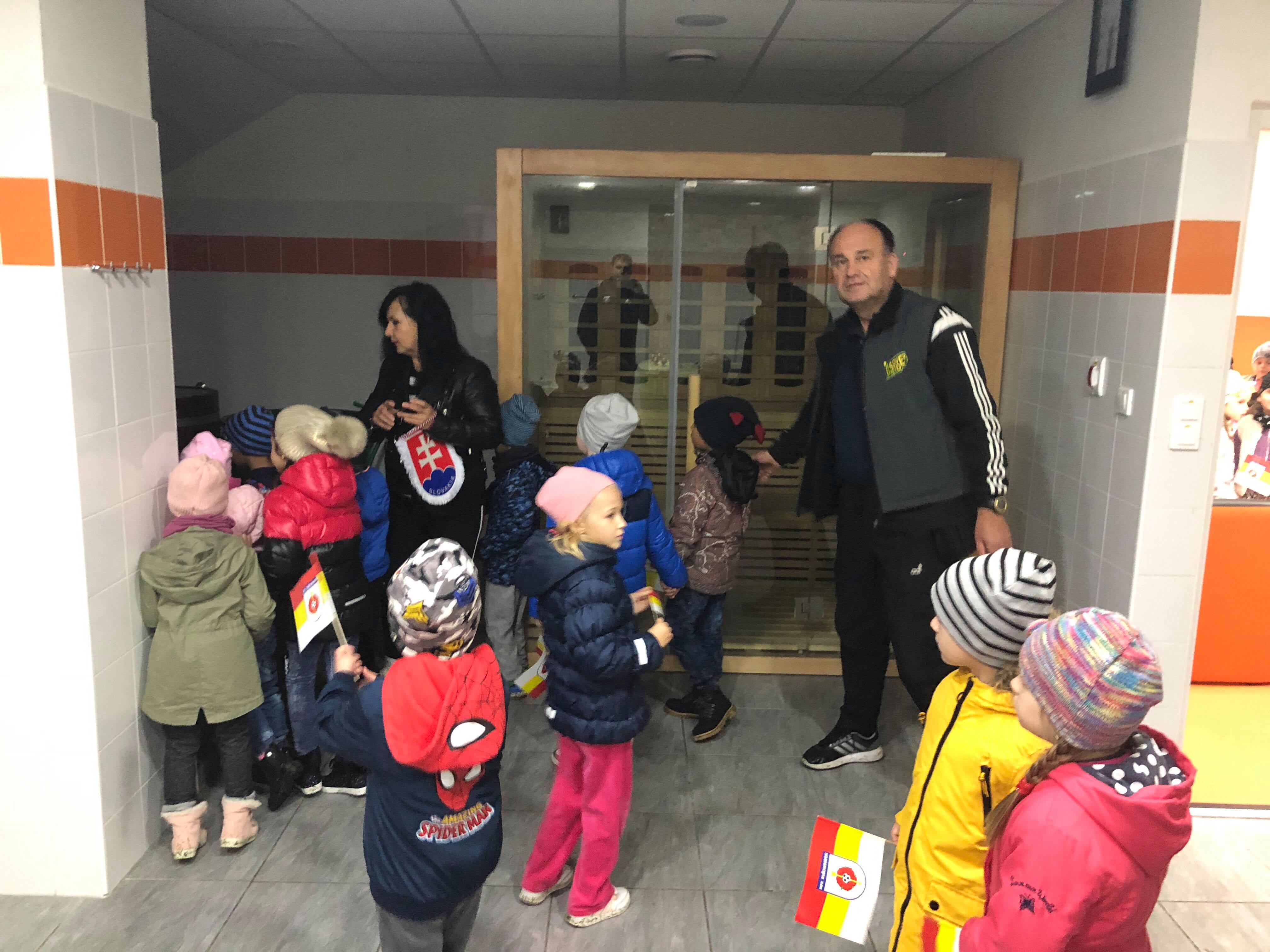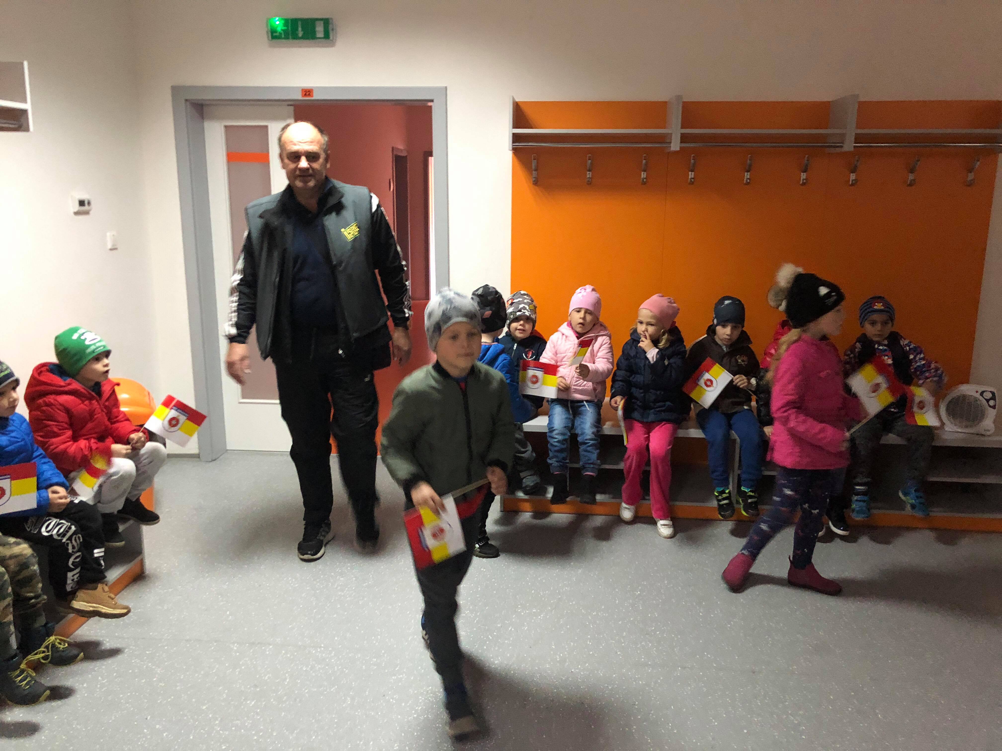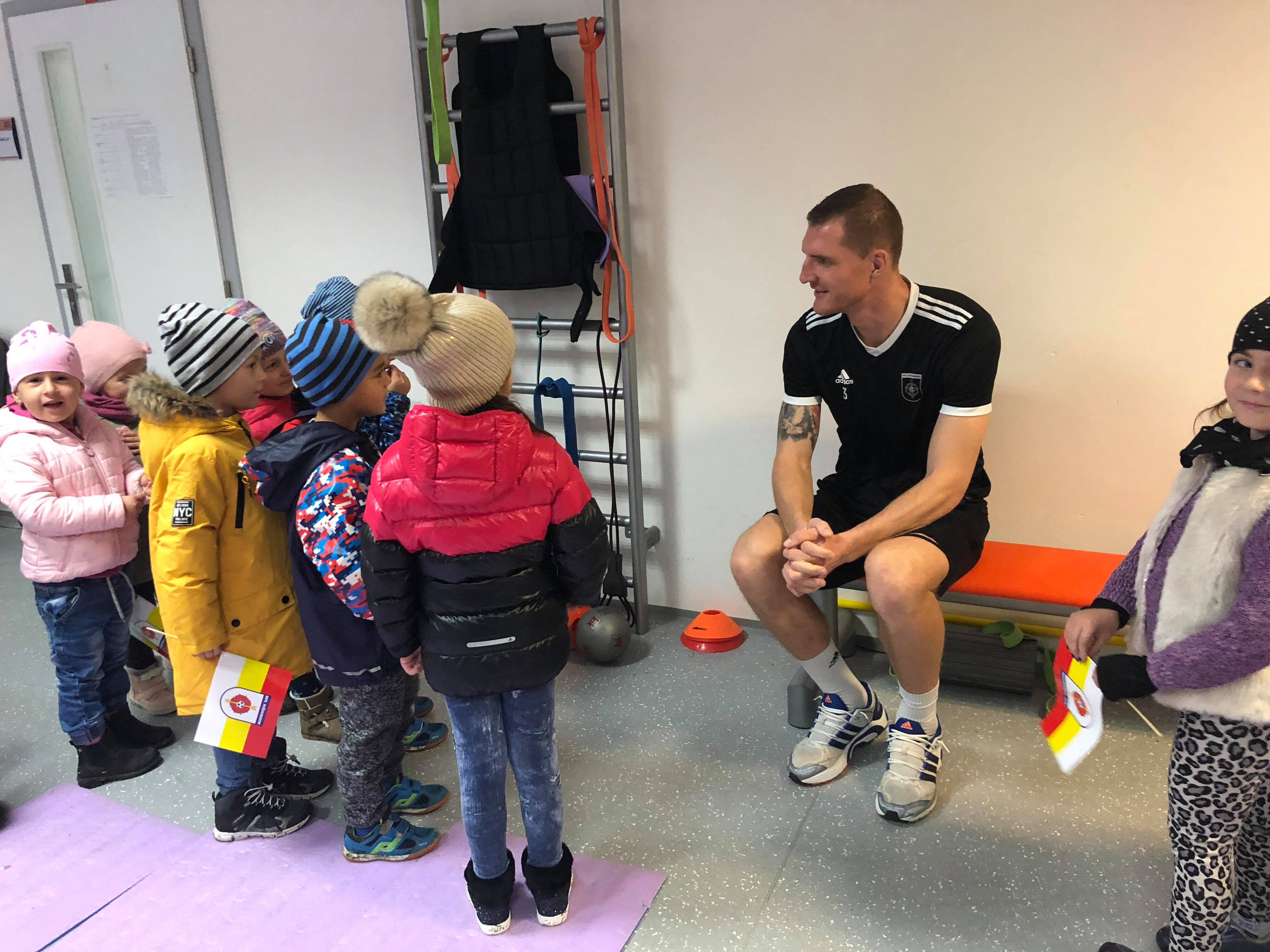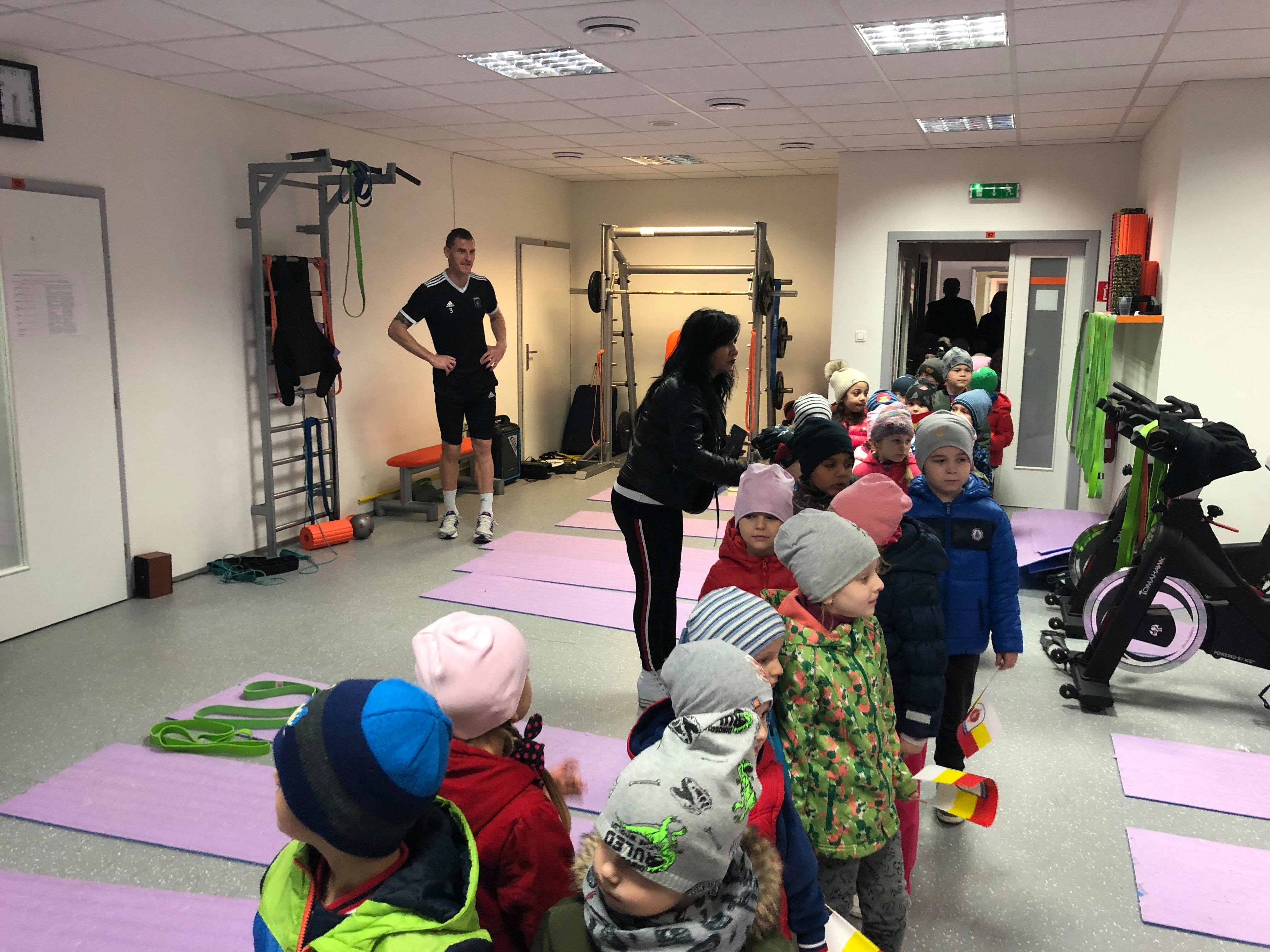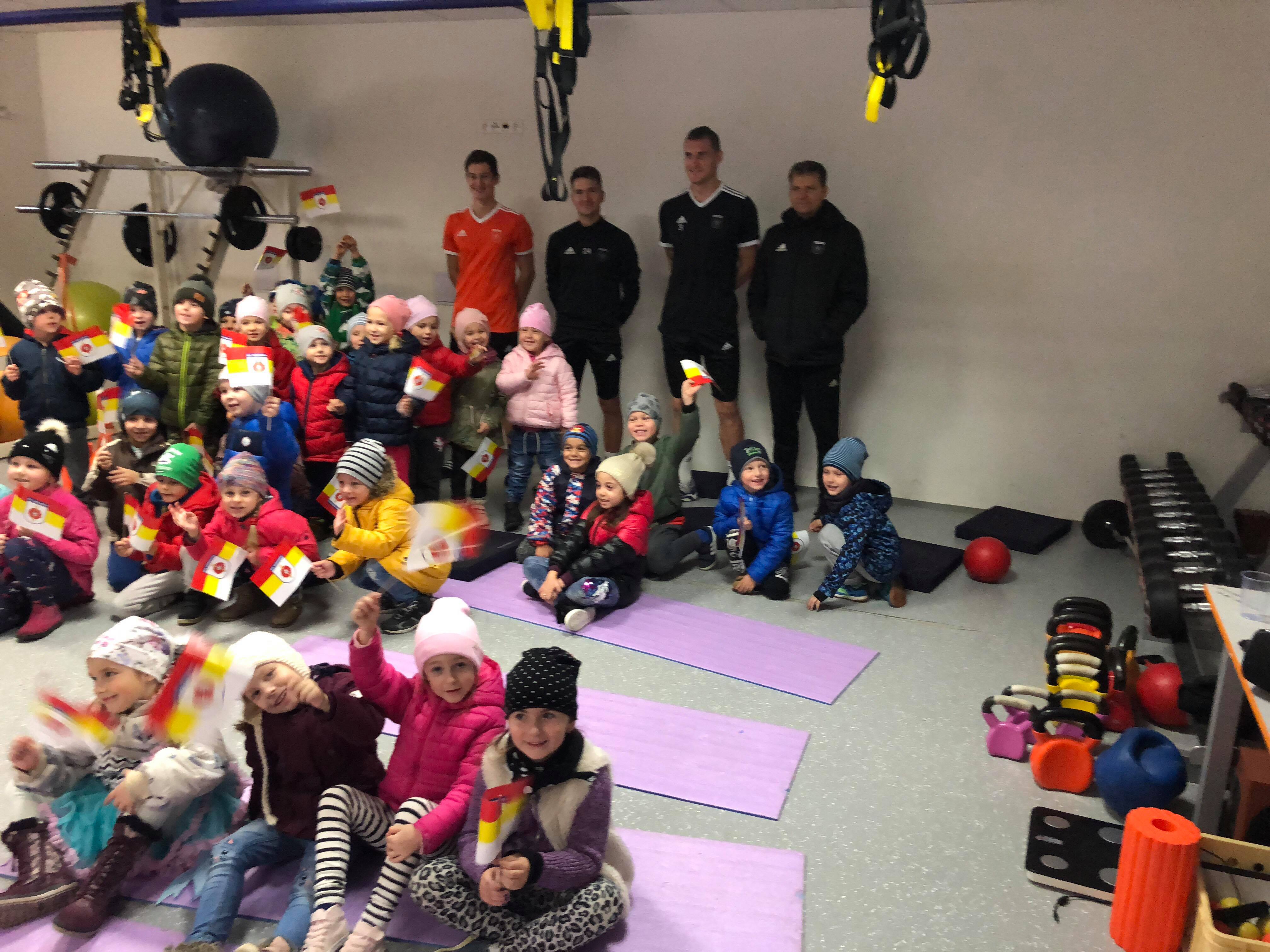 Matej Madleňák, Adam Brenkus, Ján Maslo a Róbert Hazucha s deťmi z MŠ.