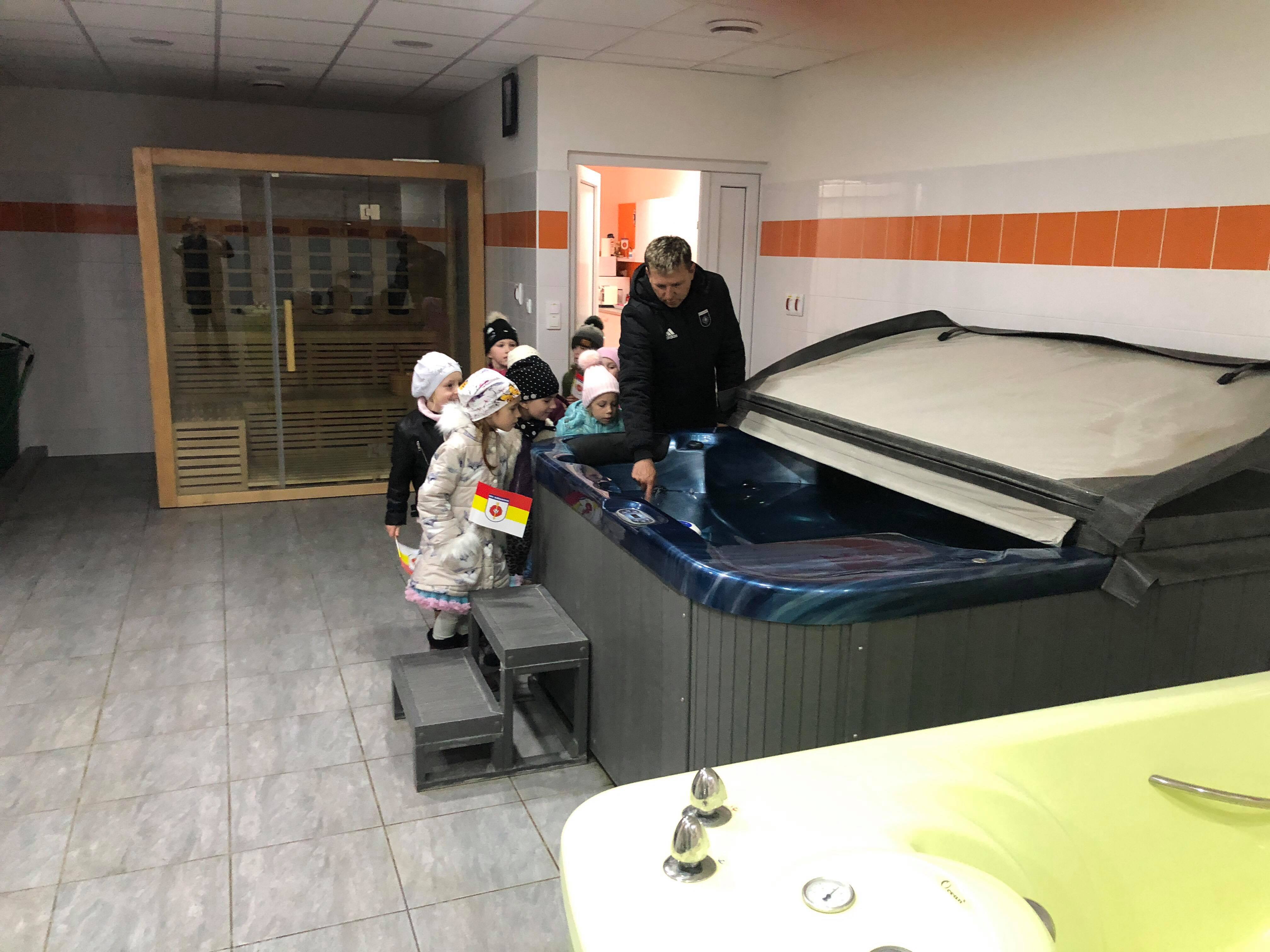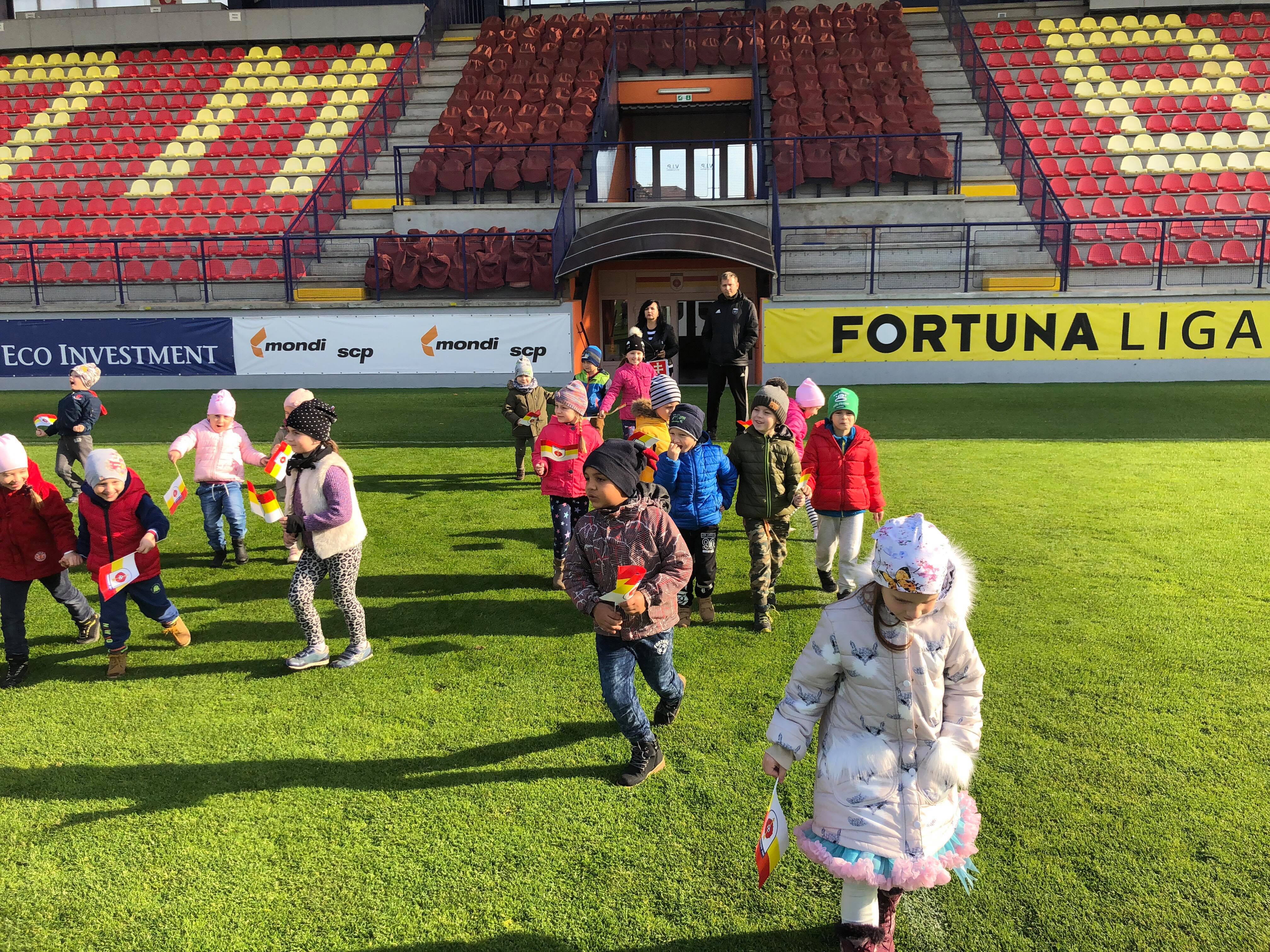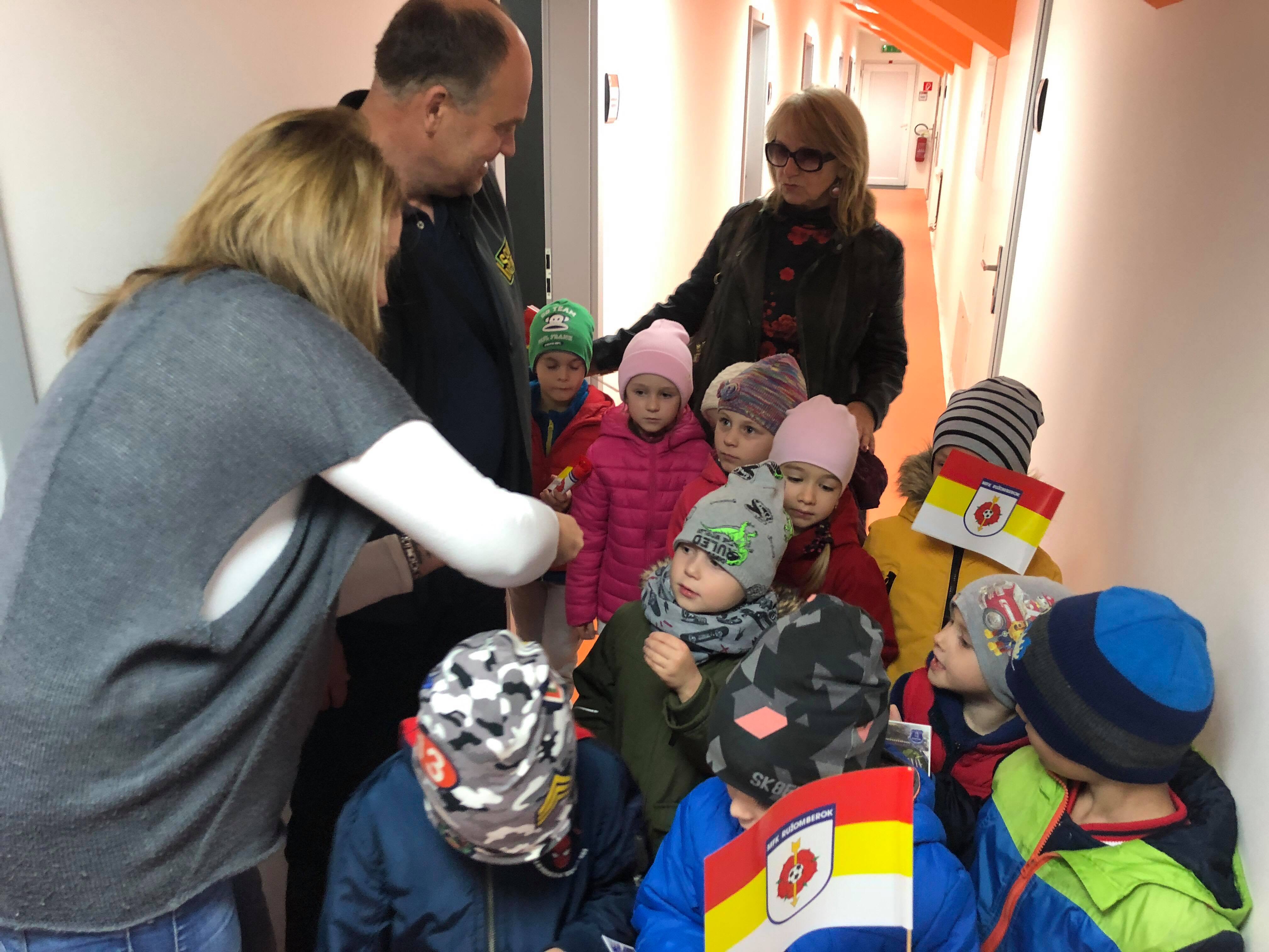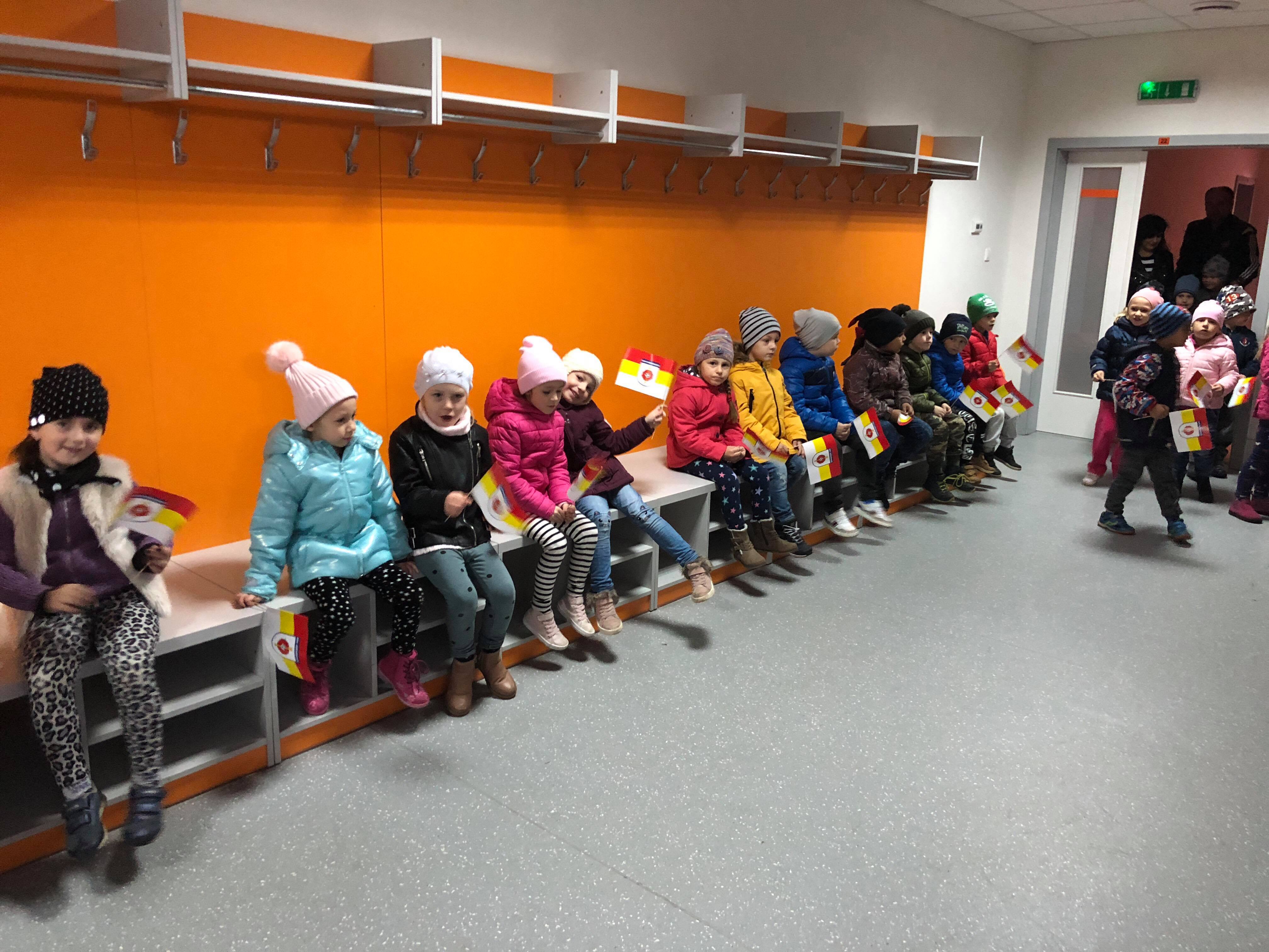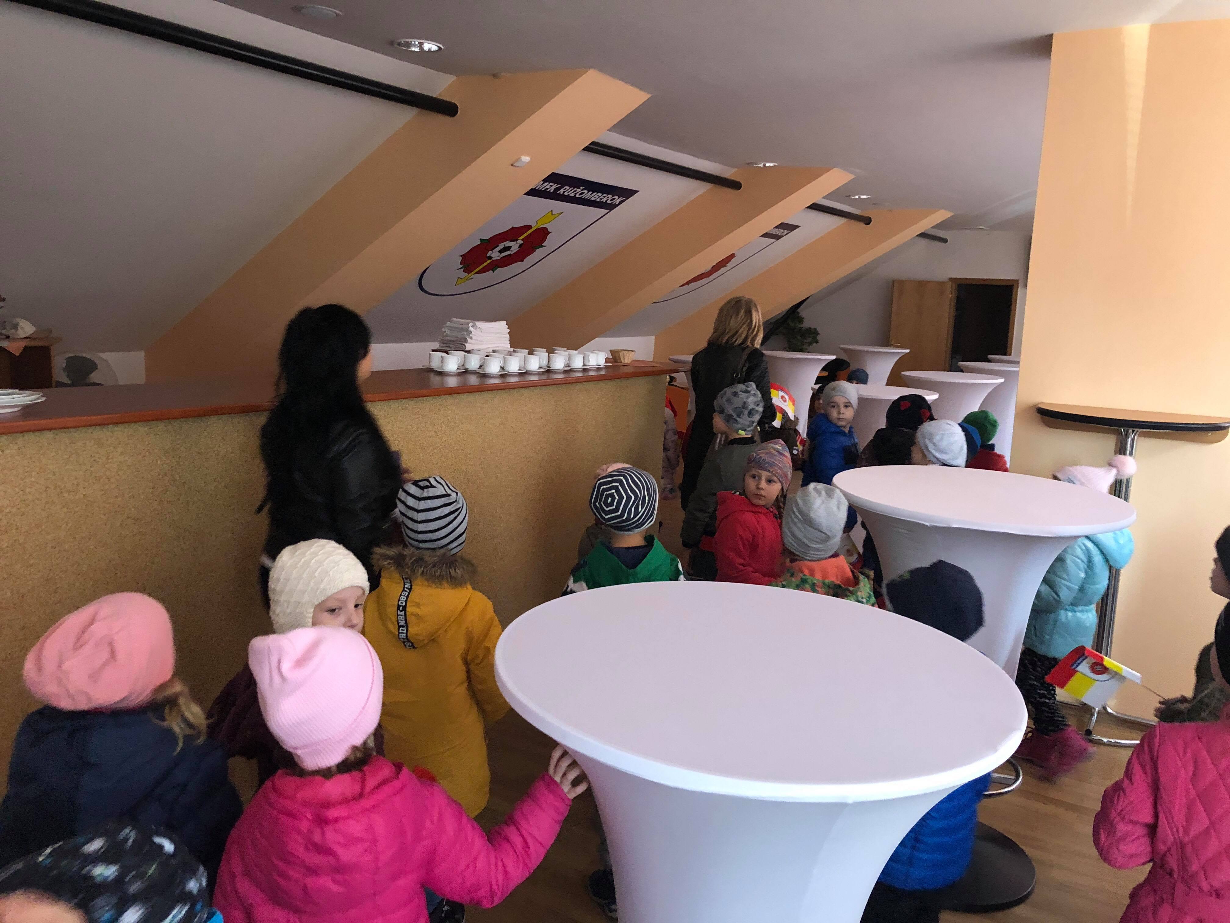 Matej Madleňák, Adam Brenkus, Ján Maslo a Róbert Hazucha s deťmi z MŠ.