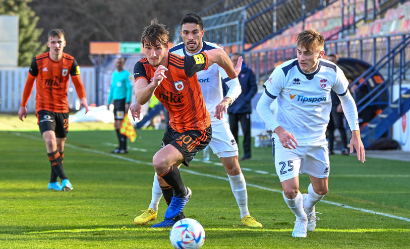 Prvú výraznejšiu šancu mali hostia v 18. minúte, kedy Selecký našiel centrom z ľavého krídla Tučného, no ružomberskému futbalistovi v dobrej pozícii nevyšlo zakončenie podľa predstáv. Vzápätí na opačnej strane Čerepkai znepríjemnil život rozohrávajúcemu Frühwaldovi, ktorý napokon ustál situáciu. Domácim aj neskôr takmer vyšlo napádanie domácej rozohrávky, keď Pinte uchmatol loptu Malému a už sa zdalo, že pôjde sám na bránu, no Malý v poslednej chvíli napravil svoje zaváhanie úspešným defenzívnym zákrokom. V 45. minúte Domonkos odcentroval z ľavej strany k bližšej žrdi, odkiaľ Gerec hlavičkoval mimo brány. Po minúte zahrávali Liptáci priamy kop. Selecký neposielal center do šestnástky, ale zvolil prihrávku na Šefčíka, ktorý prudko vypálil z veľkej vzdialenosti a Lukáč vyrazil jeho strelu. V samom závere polčasu Fabiš v páde mieril nad brvno.
