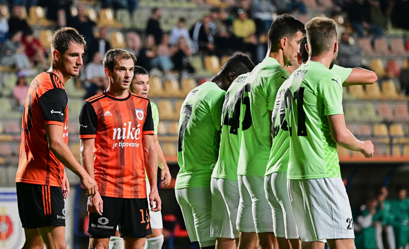 V 5. minúte Chobot vystrelil z hranice veľkého vápna, no zakončenie spoza hradby tiel chytil Junas. O dvanásť minút Gabriel po rohovom kope hlavičkoval nad brvno. V 21. minúte na opačnej strane si najskôr Frühwald poradil s nepríjemnou strelou Rudzana, no už po chvíli Gabriel nešťastne usmernil loptu do vlastnej brány – 1:0. Po deviatich minútach domáci zblokovali Hladíkovu strelu tesne vedľa bližšej žrde. V 36. minúte po sérii domácich rohových kopov hlavičkoval Smékal nad brvno. O osem minút Gerec z uhla minul bránu. Na konci polčasu sa Gaži ocitol vo veľkej šanci a jeho strelu vyrazil Frühwald.