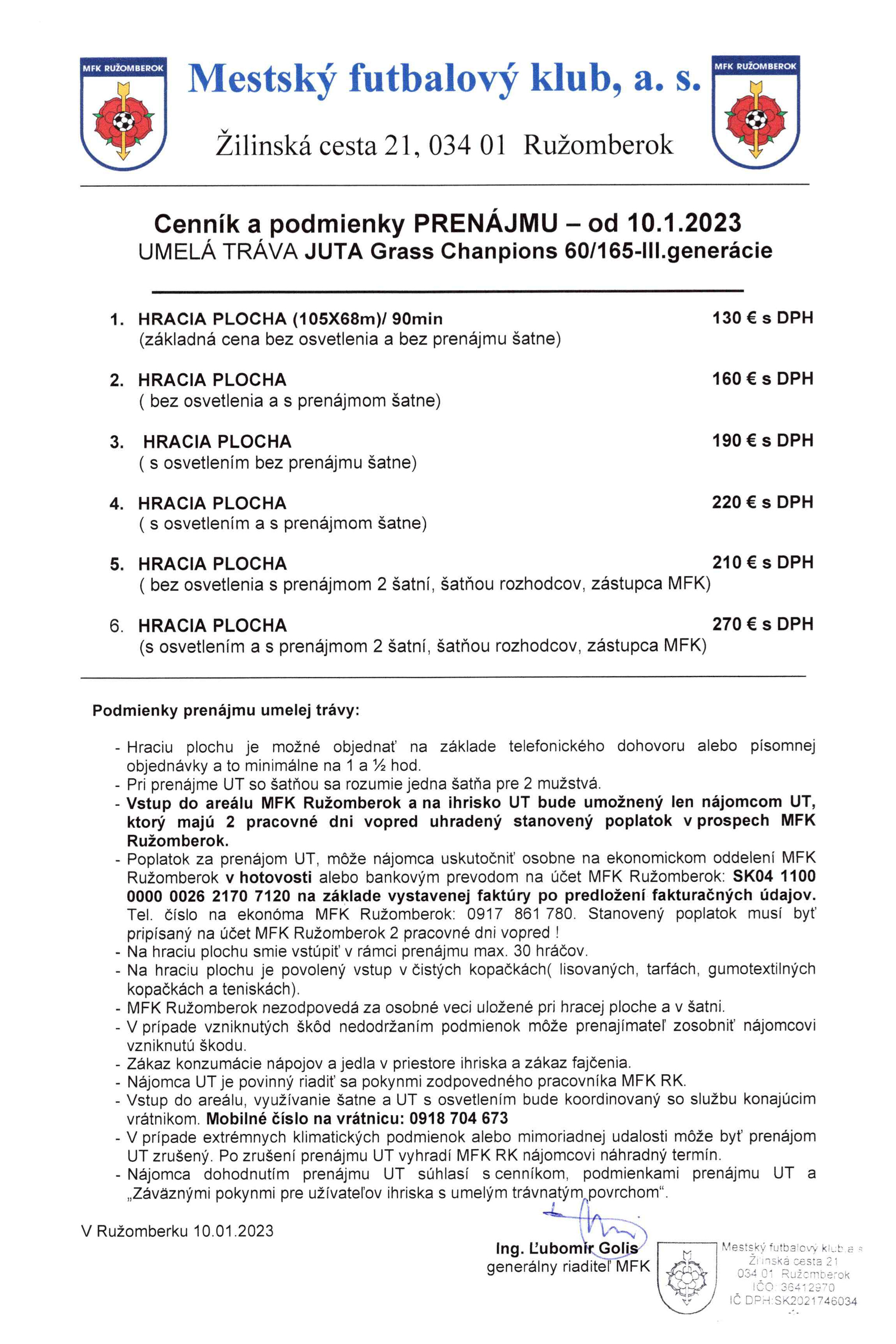 melý trávnik je možné po dohode s klubom MFK Ružomberok využívať aj na futbalové tréningové jednotky a komerčné futbalové zápasy v cenách podľa priloženého cenníka.
